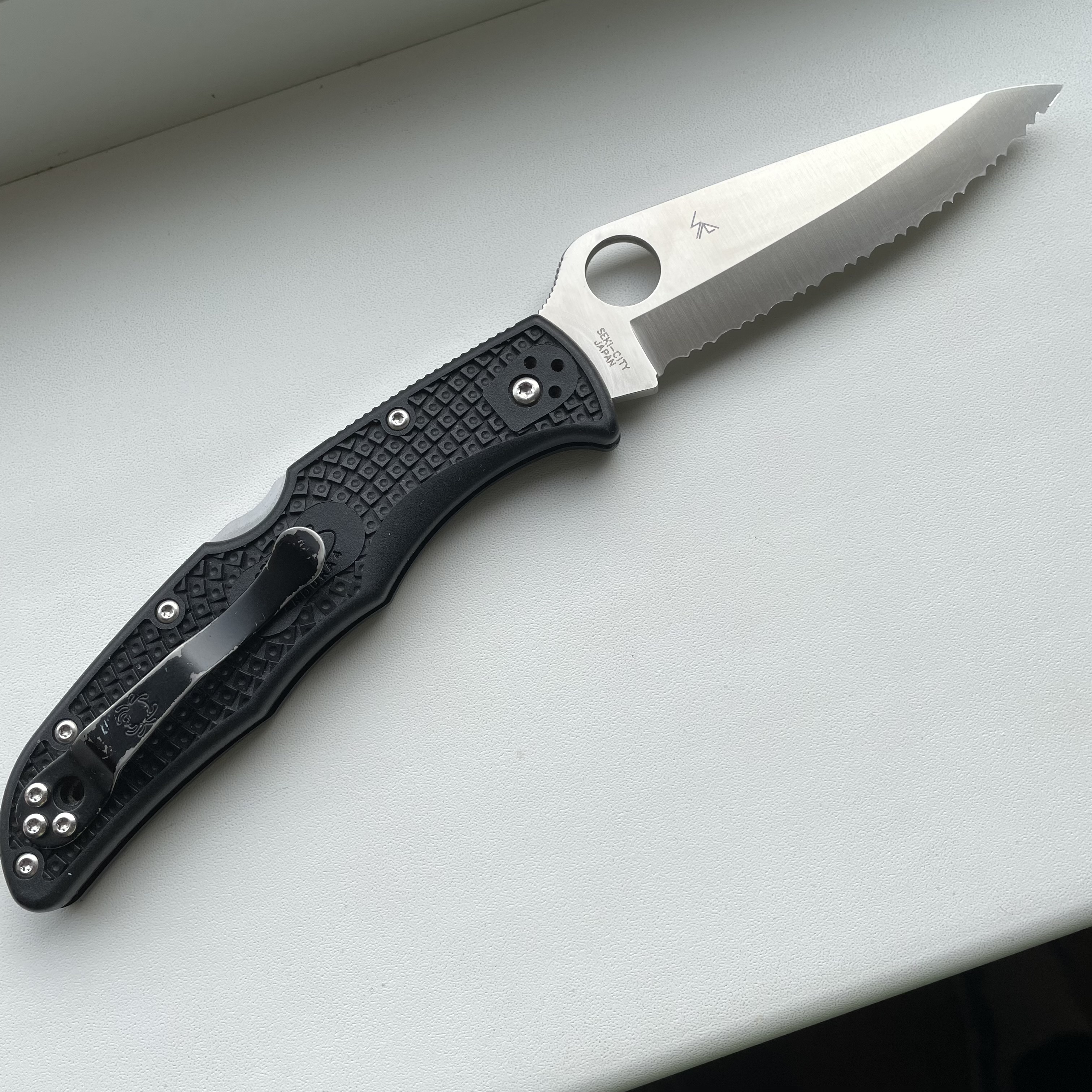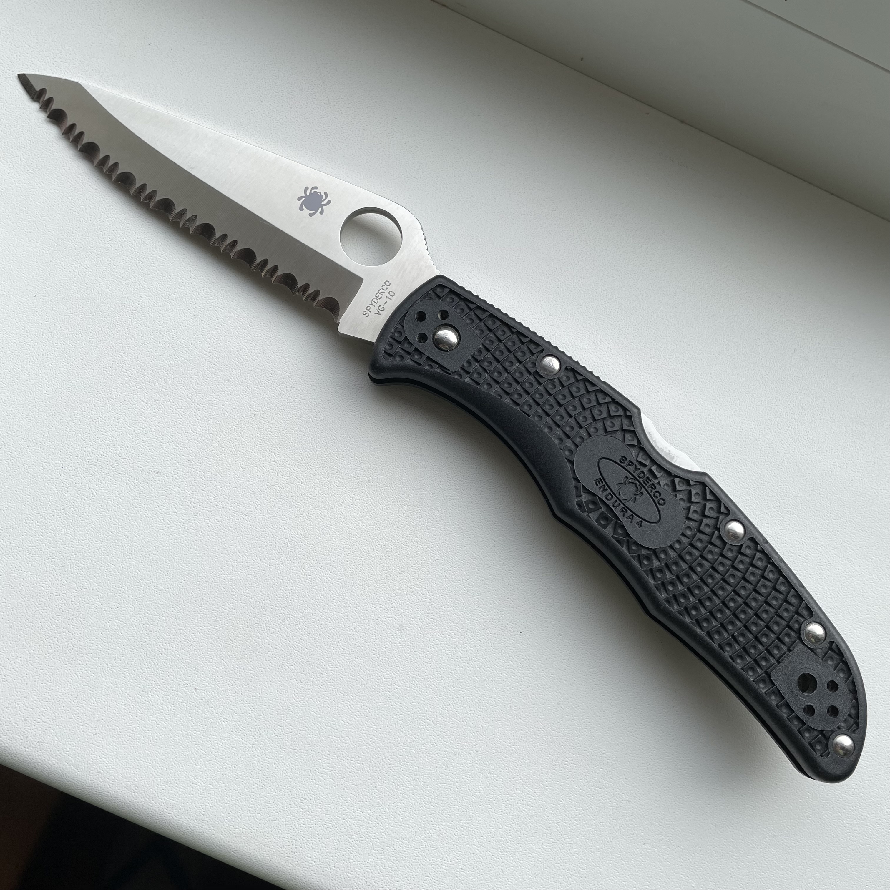 Spyderco Endura 4 VG-10 серрейтор (б/в, без коробки) Ціна - 3500грн. Загальна довжина: 223 мм Довжина леза: 97 мм Товщина леза: 3,0 мм Матеріал леза: VG-10 Твердість клинка (HRC) 60-61 Довжина закрита 126 мм Товщина ручки: 10,9 мм Матеріал рукояті: FRN Позиція затискача: 4-позиційний Походження: Японія Тип замку: Back Lock Вага: 108 г #Spyderco #Endura4 #VG10