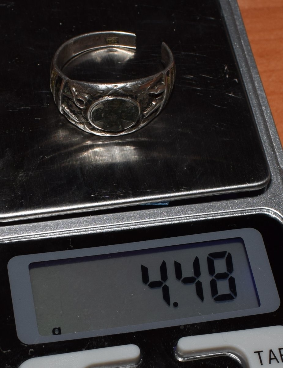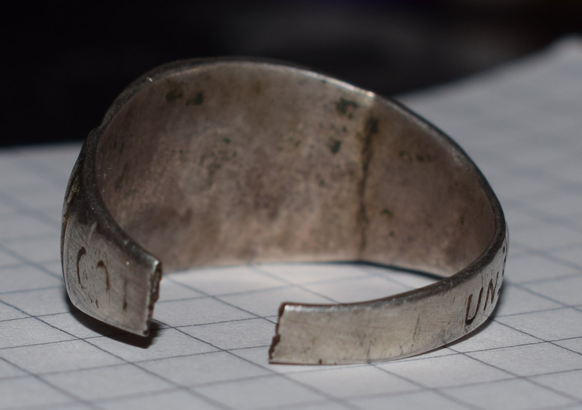 Кольцо патриотика на ПМВ.На задней части кольца была надпись GOTT MIT UNS. Слово MIT ушло в небытие. Эмали немецкого и австрийских флагов практически тоже. Спереди скорее всего был припаян ЖК.Он утерян,остались остатки пайки. В хорошем состоянии такое стоит наверное 50-70 у.е.В таком состоянии тяжело сказать....