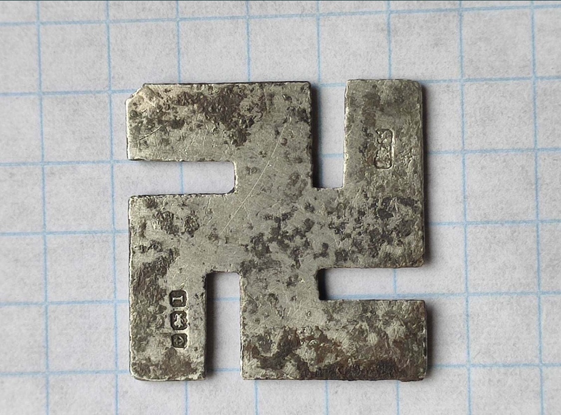 Імхо, це не Рейх, пробірні клейма ніби британські (Бірмінгем), можливо, камрад https://reibert.info/members/gregson.83915/ по даті підкаже точніше. Припущу, що брошка, але також може бути підвіска, частина закладки для книг і т.п. кінця 19-початку 20 ст. Тоді свастика вважалася символом удачі, везіння. Ось із таким клеймінням як у Вас.