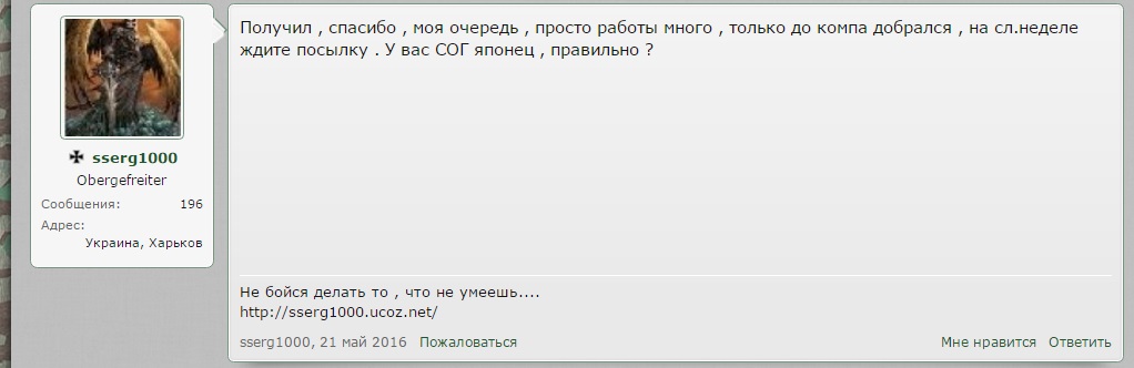Заказал чехол на нож..форумчанину sserg1000..он пообещал..я заплатил частичную предоплату..чехол обещал изготовить и выслать на прошлой неделе..пошла вторая неделя..ни чехла ни связи с ним..!!!Вот мучаюсь вопросом..КИДАЛОВО ИЛИ НЕДОБРОСОВЕСТНОЕ ОТНОШЕНИЕ..?!!Или может он действительно..просто очччень занятой человек..а я ,,зря волнуюсь,,..?!