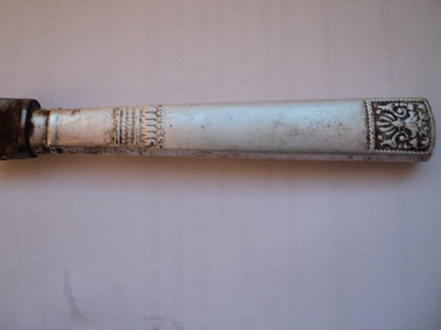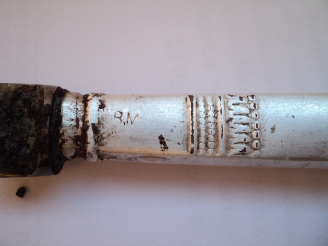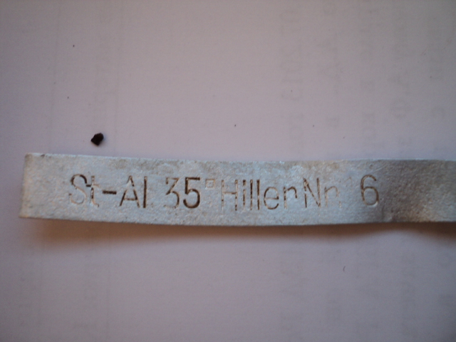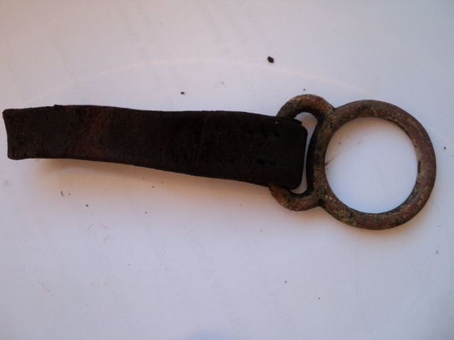 Среди последних находок попались такие. Обломок столового ножа. Ручка похоже покрыта серебром. Для алюминия тяжеловата, и видны следы протертости поверхностного слоя. Есть клеймо из двух букв. Что это? Инициалы владельца? Что-то по форме типа очков. Ремешок с кольцом. Конина? И алюминиевая полоса с клеймом. Интересно от чего она. Была согнута.