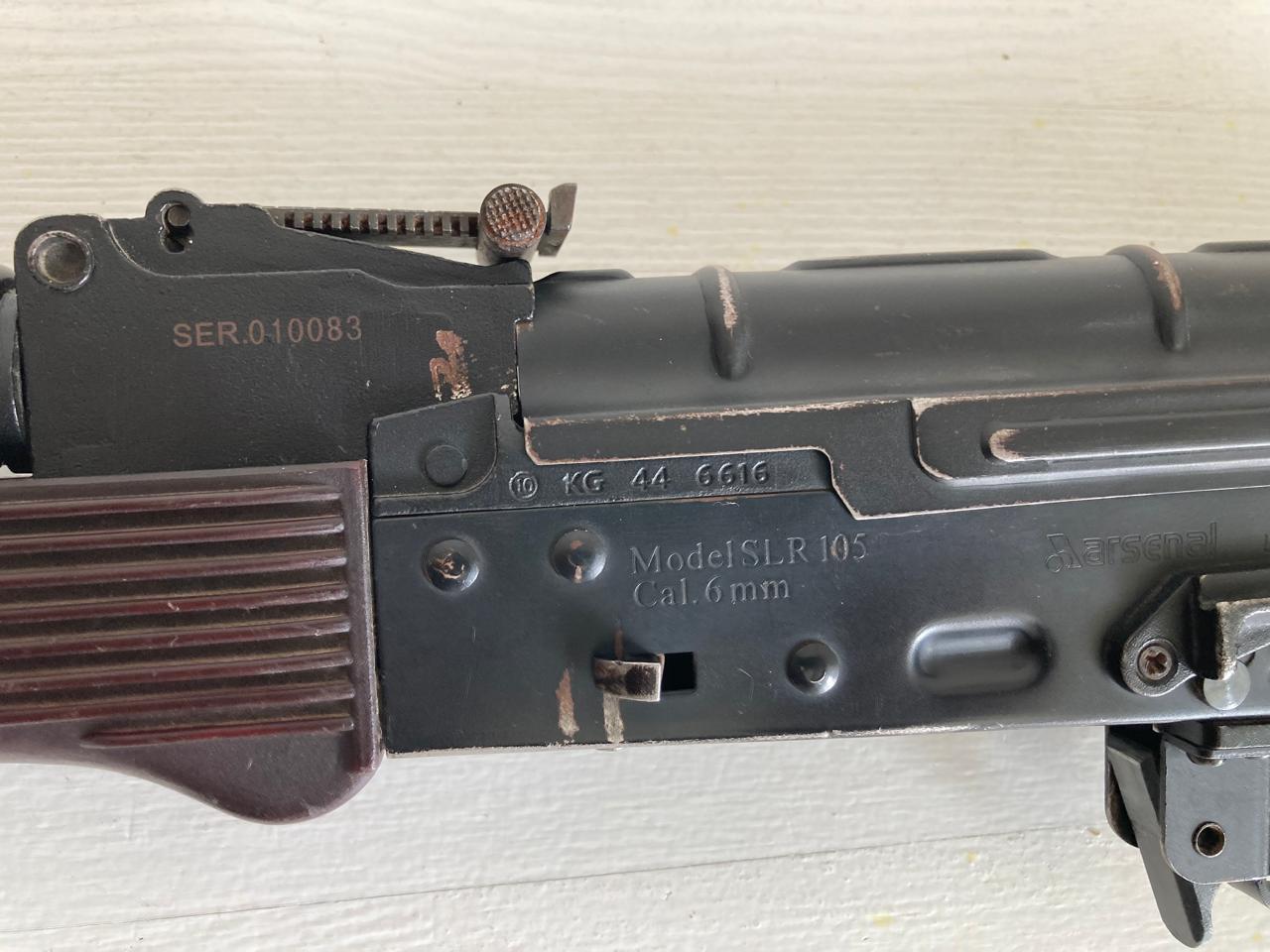 1. Classic Army SLR-105A Steel version - полностью стальной АКС-74 под 6мм шарик. Не магнитится разве что защелка крышки ствольной коробки. Внутри менялось наверно все, кроме стенок гирбокса. Аккумулятор переведен на Т-коннектор. Из обвеса заменены на детали из ЗИПа: цевье и накладка, целик, мушка и ее база. Добавлена накладка на приклад типа "калоша", современного украинского производства. Внешний вид - антуражные потертости, все целое и крепкое.