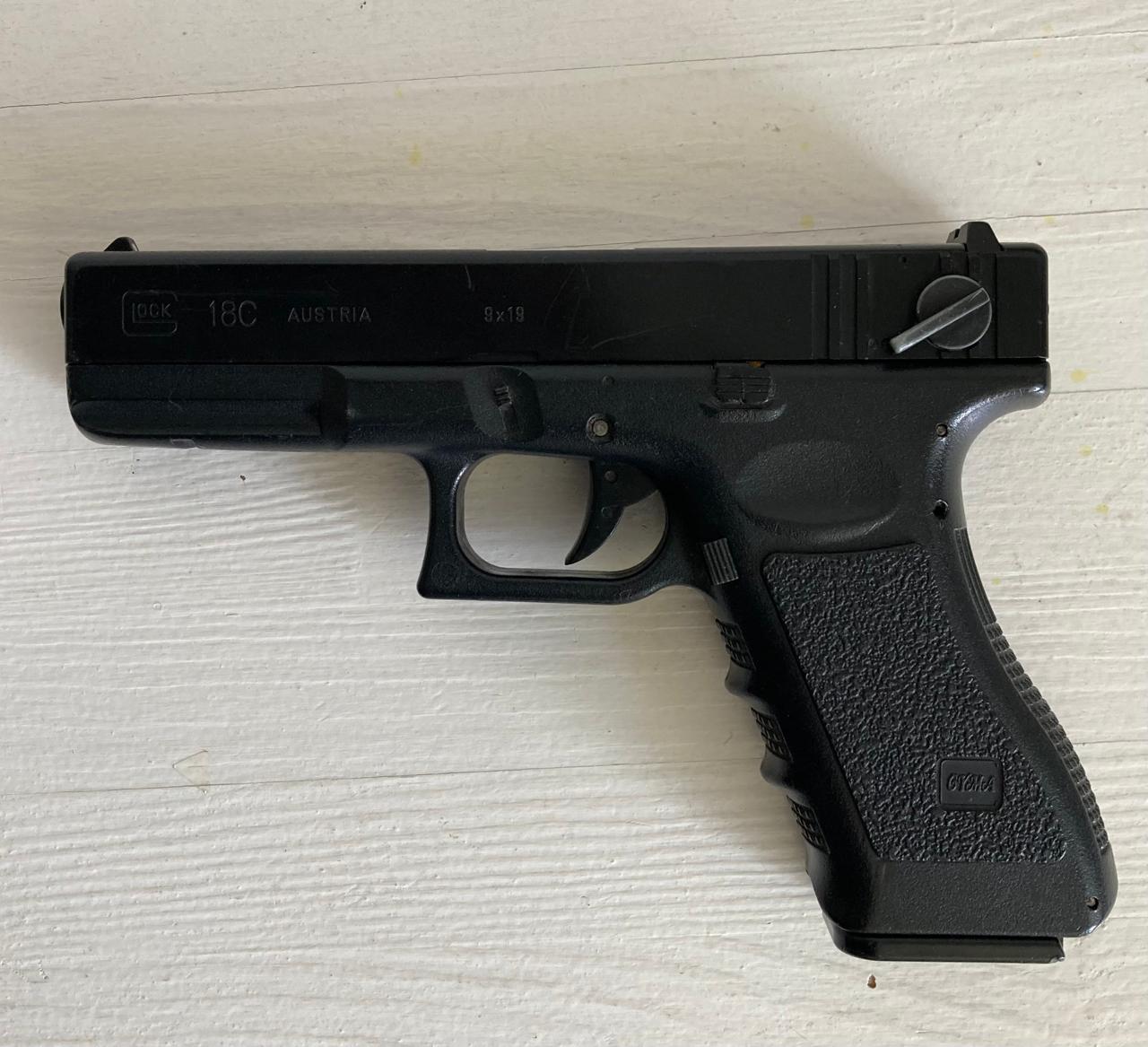Электропневматический пистолет с возможностью стрельбы очередями. Оригинальное исполнение от японцев, не копия от Cyma. Фулл-пластик, но неубиваемый. По рассказам первого владельца вообще первый Глок-18Ц в Украине, куплен в 2006м году. Был приведен в порядок, разъем аккумулятора перепаян на Т-коннектор. Работает. В комплекте аккумулятор (заряжается, пистолет стреляет), 2 магазина, второй судя по всему от китайца. Внешне потерт, на торце затвора откололся пластик, слегка подмарафечено эпоксидной шпатлевкой.