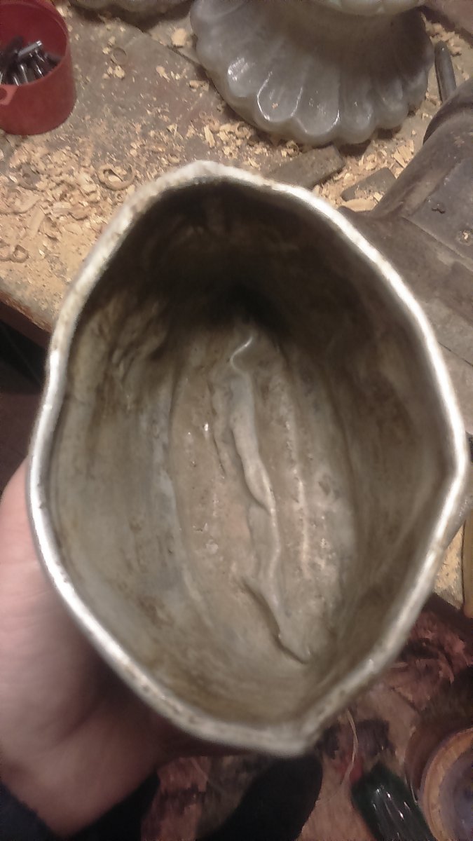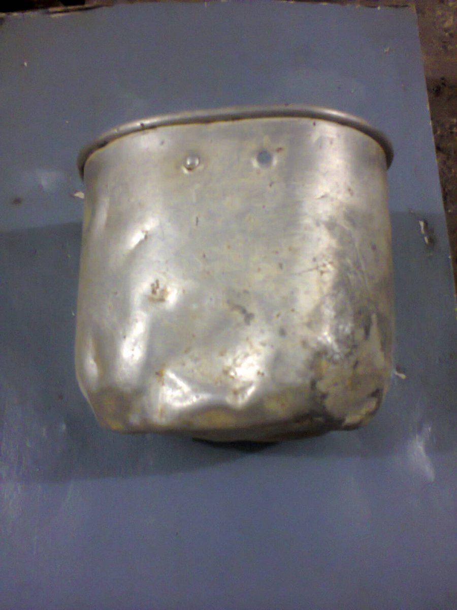 Хочу Вас немного разочаровать-Вы убили своими действиями манерку от венгерской фляги М35.На первом фото она в своей первоначальной форме,просто с вмятинами и с оторванной ручкой,а Вы изуродовали дно и получили в итоге хз что.При жизни была такой .И ссылочка на комплектную флягу