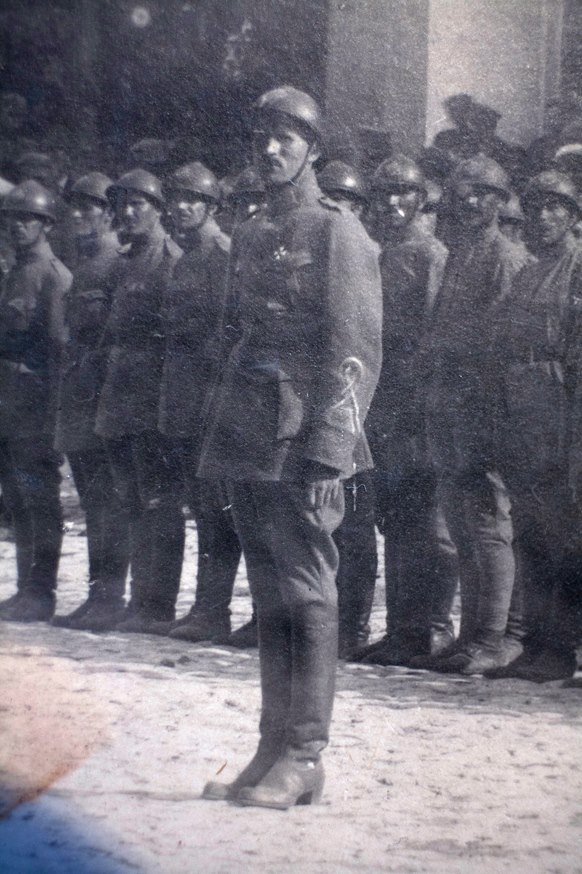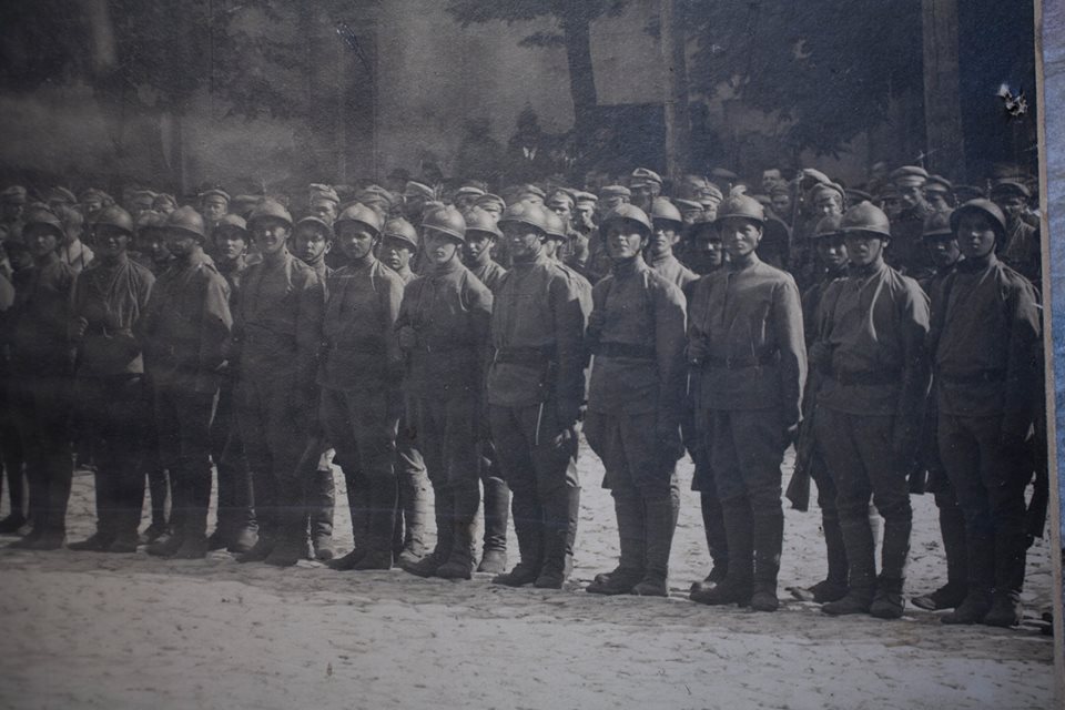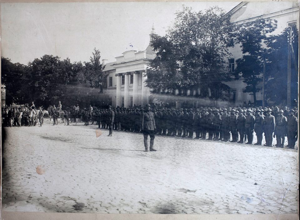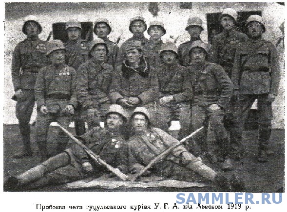 Думаю вартує перекинути ці фото сюди. Набір фото з параду УНР в Камянці Подільскому. Весь відділ в сталевих шоломах з намальованою ромбовидною емблемою з тризубом.