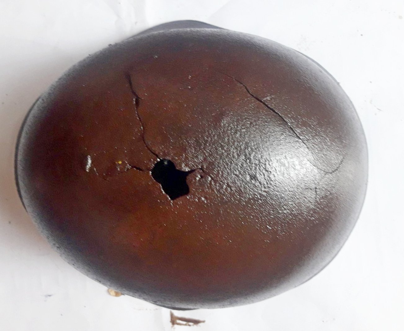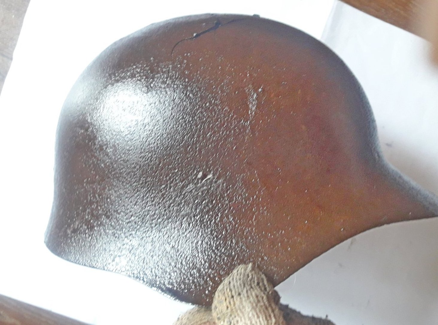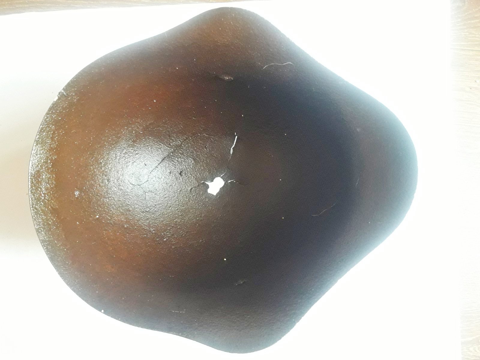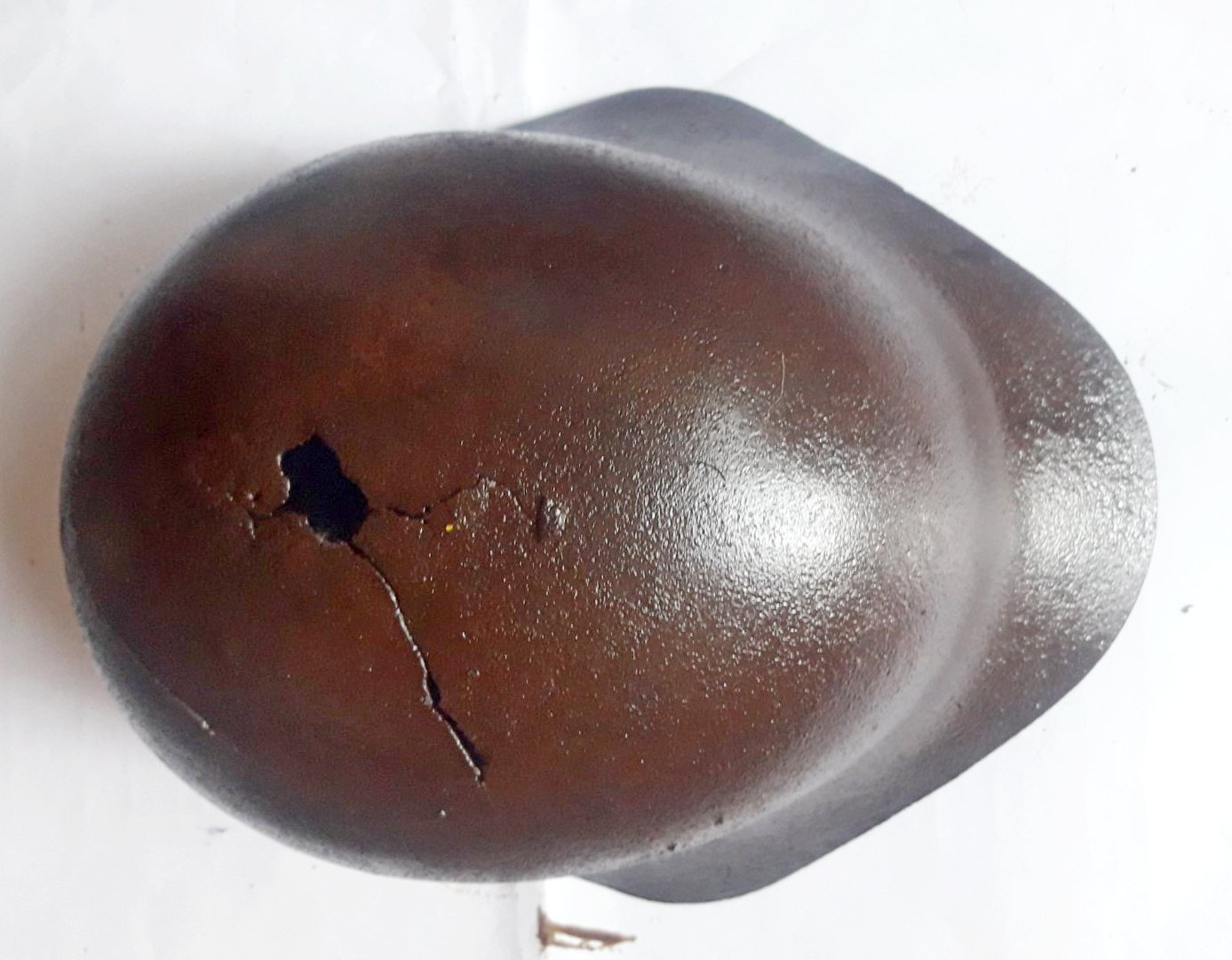 Приветствую. коллеги. Прошу оценить стоимость стального шлема РККА СШ-36 №2. Приношу извинения за фото на белом фоне - фото только такие. Размеры 30х25,5 см. Повреждения сосредоточены в области вентотверстия и еще одна трещина сбоку. Кроме этих мест сам металл шлема в хорошем состоянии, без трещин.