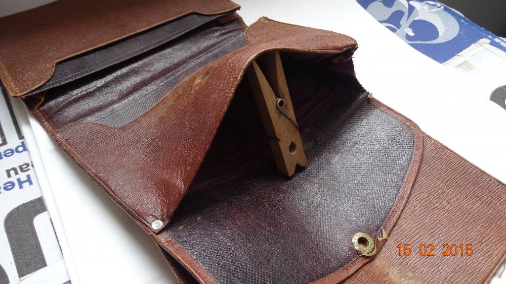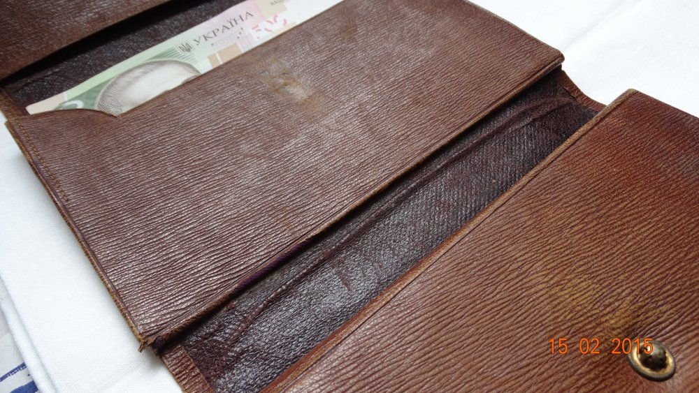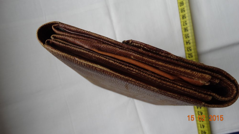 большое старинное кожаное портмоне,на кнопке клеймо С.ЭРЛИХЪ и еще какие то буквы,можно пользовать по назначению 8 отделений,большие боны влазят свободно с запасом.цена 500гр