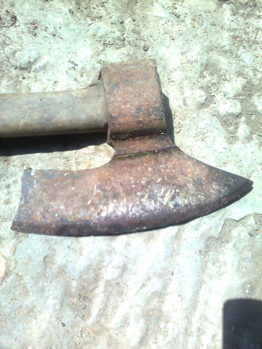 Не зря топор называют универсальным инструментом:данный потес с заточкой под правую руку хозяин использует для рубки и измельчения овощей на корм скоту.С ув.