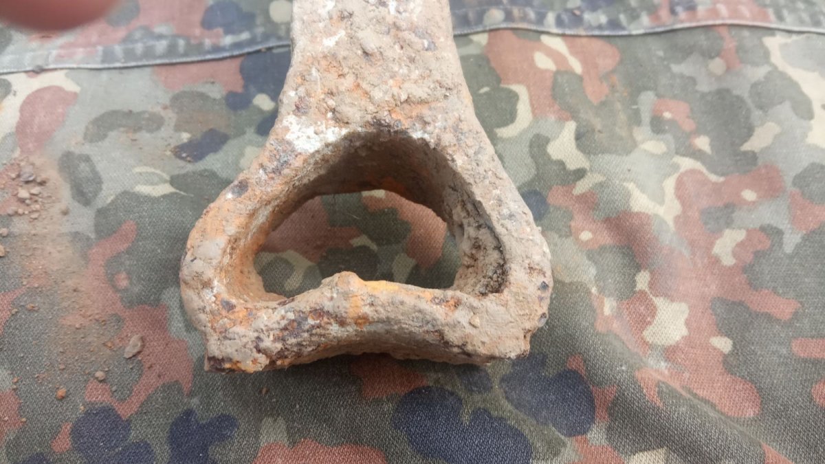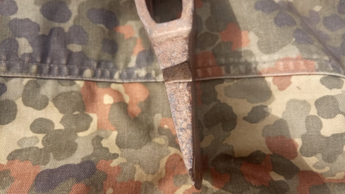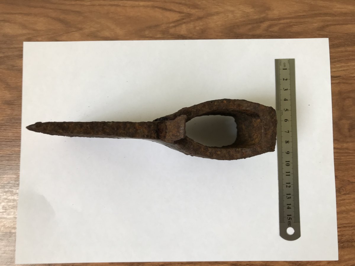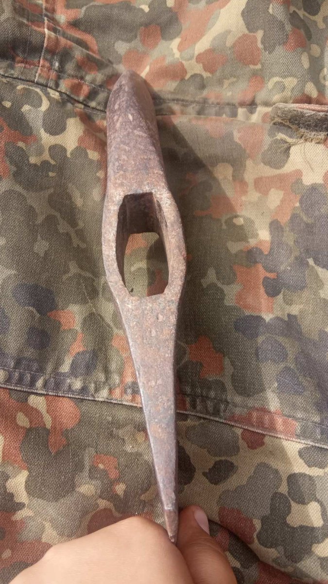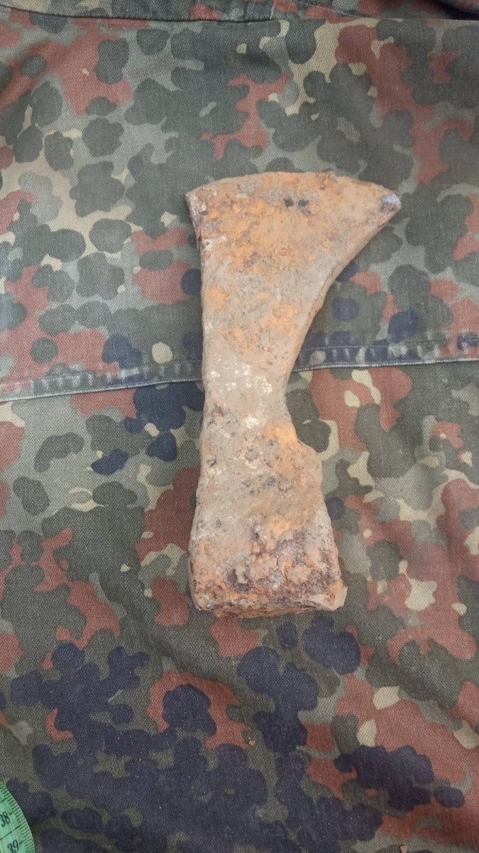 Стара, побутова сокира з розплющени обухом.Розбили обух,бо пробували використовувати як колун і зверху били довбнею,кувалдою,молотом чи чимсь подібним...