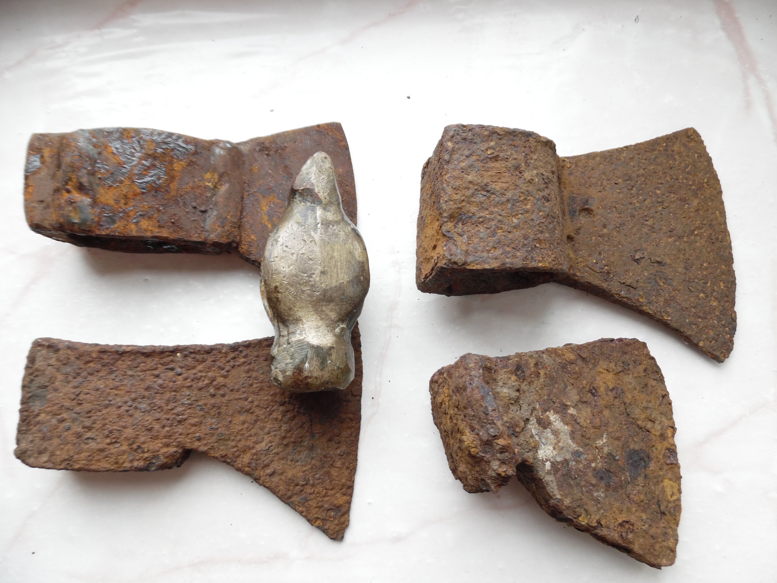 Первый и третий убитые работяги конца 19-го - начала 20-го века, второй немец, может и вермахт валочный топор, молоточек СССР для работы во взрывоопасной среде, латунь не даёт искры при ударе.