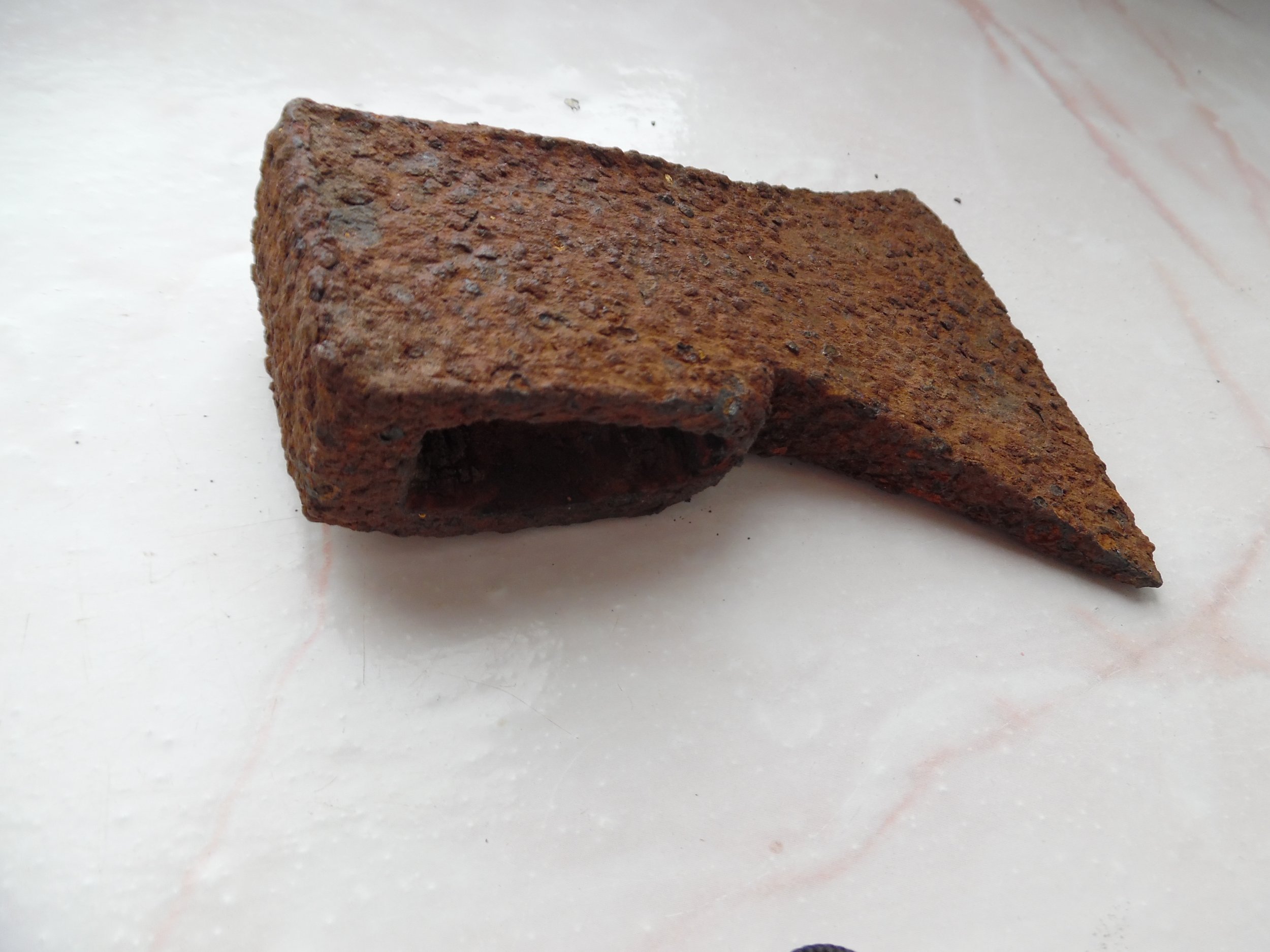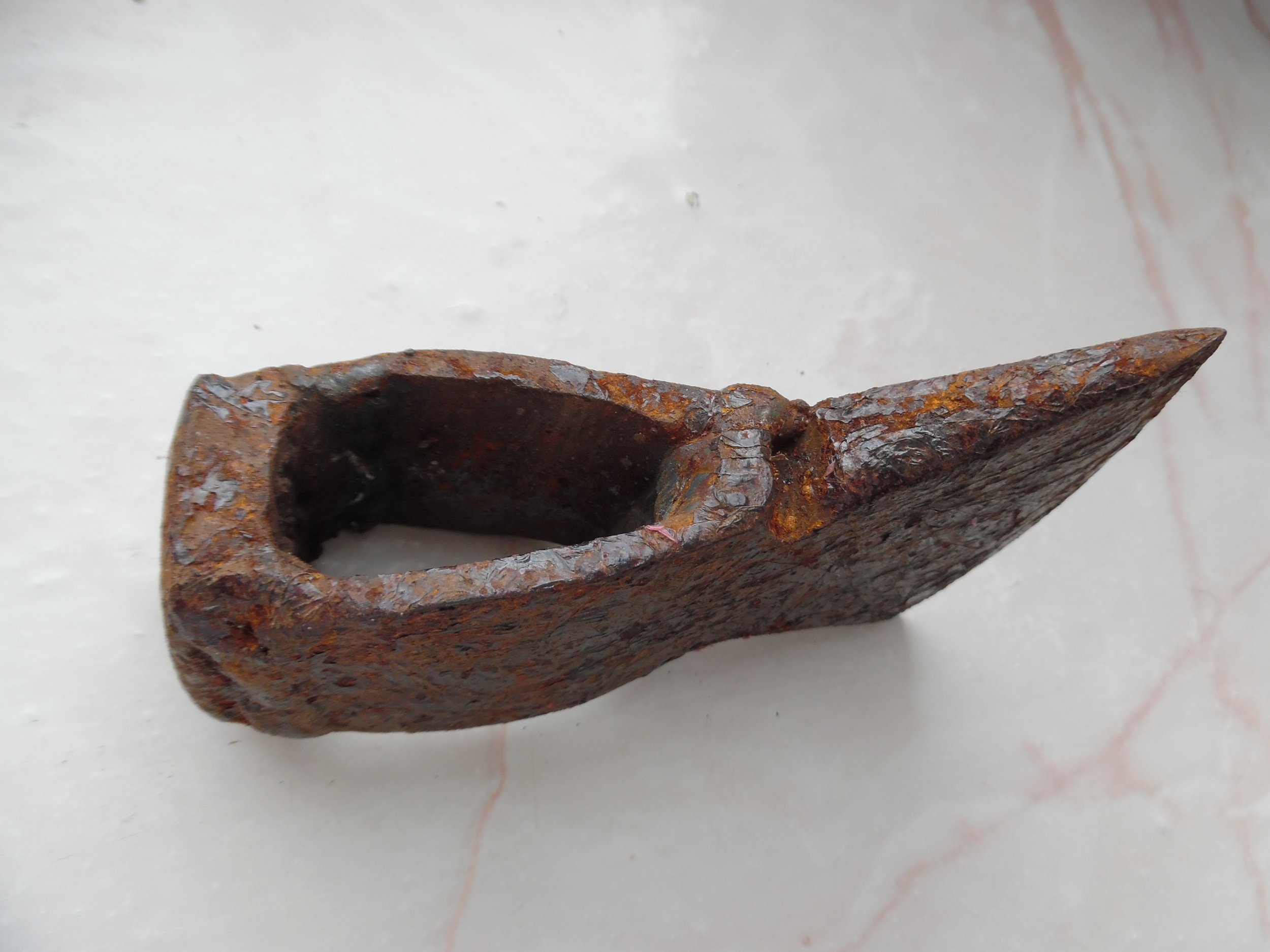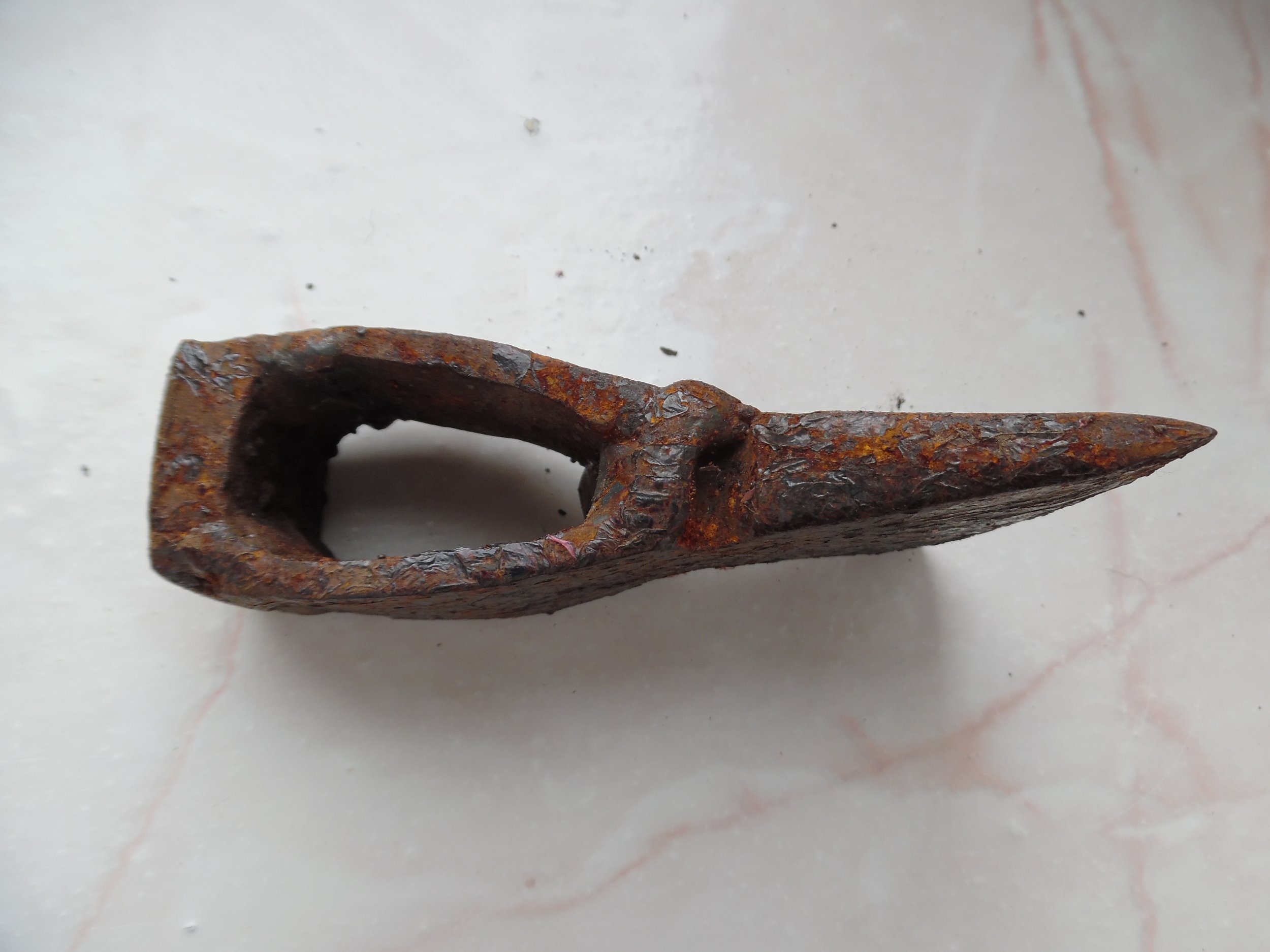 Всім доброго. Є така сокирка вагою 550 гр. , особливістю якою є овальний отвір, молотообразний обух. Що це може бути Київська Русь чи щось інше? З пов.