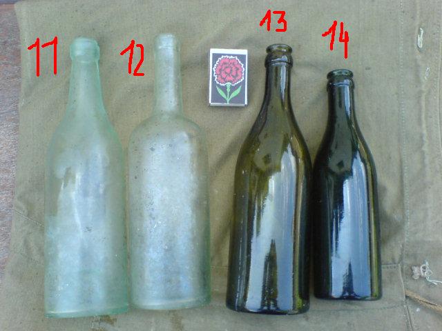 По вервому фото: 1 бутылка по моему водочная,2 вино, 3,4..возможно пиво или минералка советская, точнее можко сказать по клеймам, если таковые имеются. 2 фото- аптека, подобный пузыри никакой идентитфикации практически не поддаются, их было много и использовались для чего угодно( мази, микстуры, наливки) есть конечно "фирменные" пузыри которые имеют характерную форму или надписи допустим калинкинские бытылки, тара производимая ДБЗ (донецкий бутылочный завод) и т.д Порой сам не знаешь что нашел. Один раз нашли орленую бытылочку, то же аптечная, с какой то надписью иностранной. Перевели, нашли информацию.. и оказалось что там что то связано с ЧУМОЙ. оказалось какое то лекарство производимое до революции в Финляндии...:D
