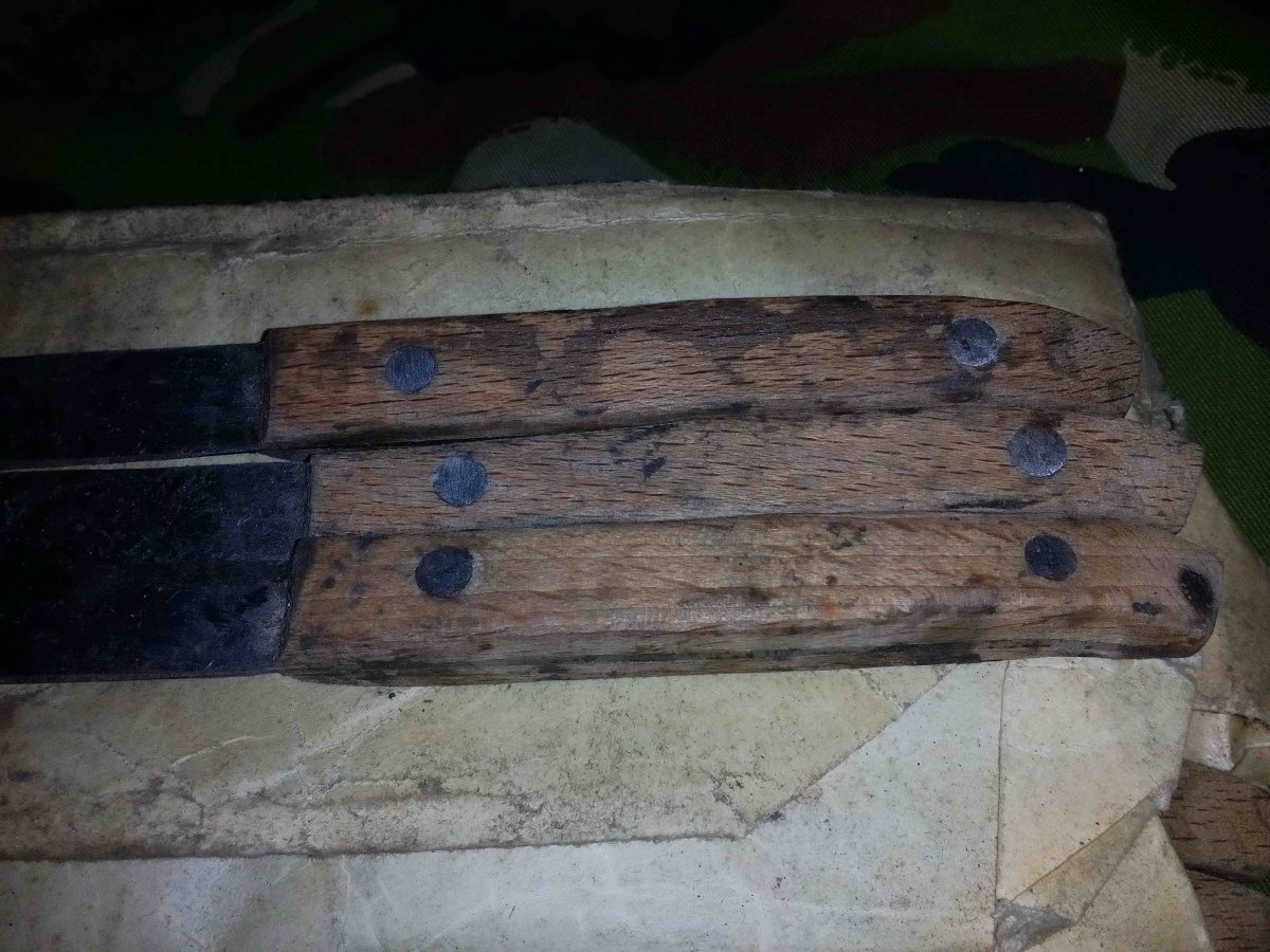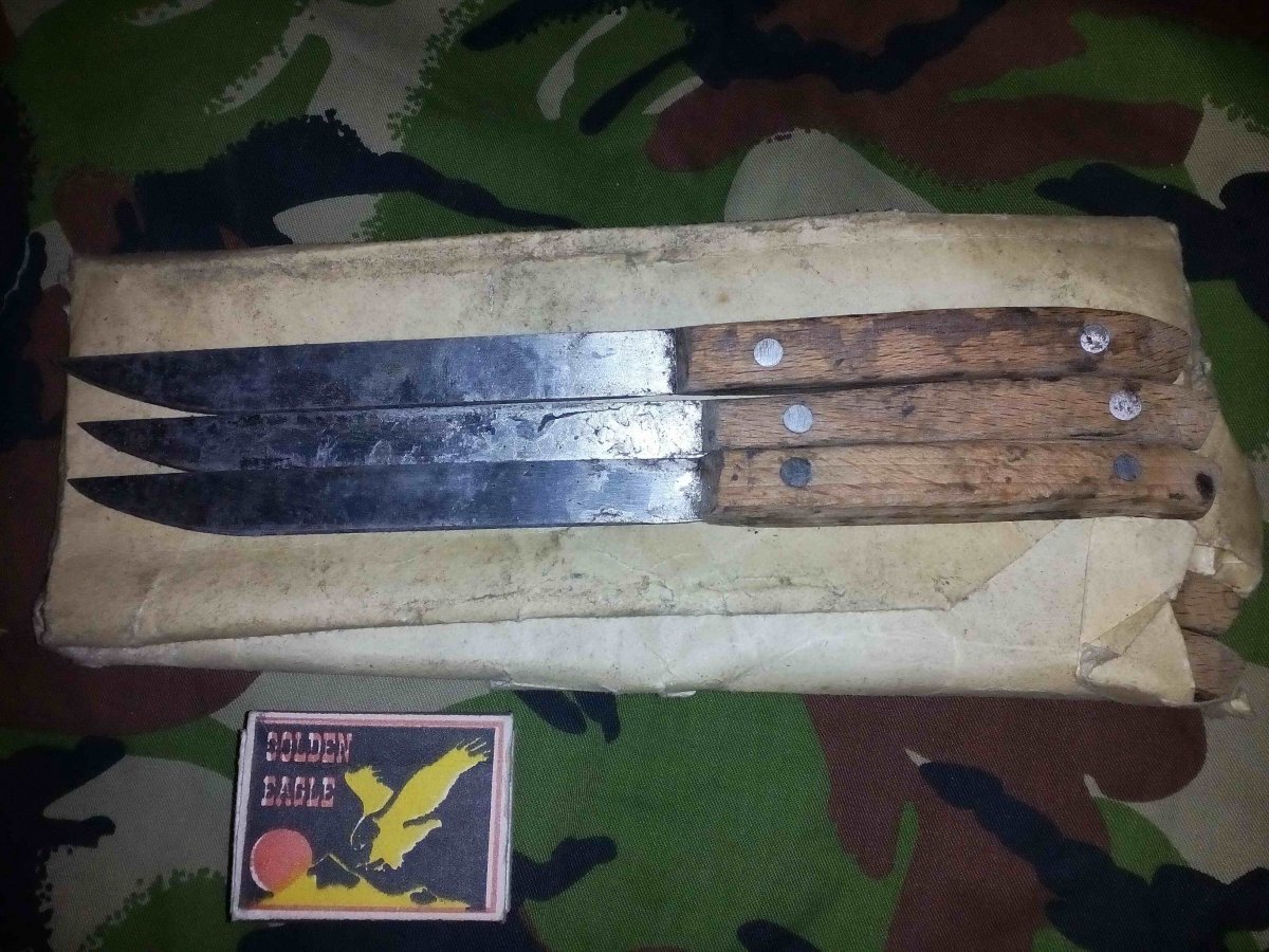 Продам столовые ножики, производство СССР. Ручка из дерева, полотно ножа - углеродистая сталь. Сталь не особо толстая, поэтому полотно не жёсткое. Складские, не точенные. Хранились долго, внешний вид по фото. Из опыта - ножом на рыбалке (морской) резалась наживка, из-за соли нож быстро корродирует, нужно следить за чистотой полотна. ПРОДАНО