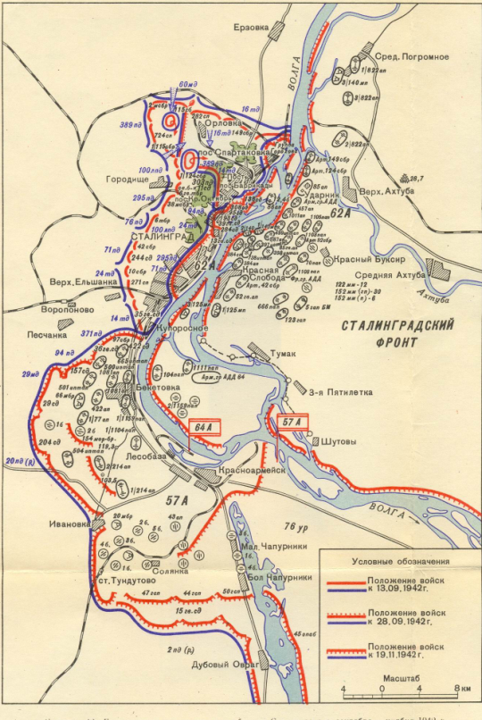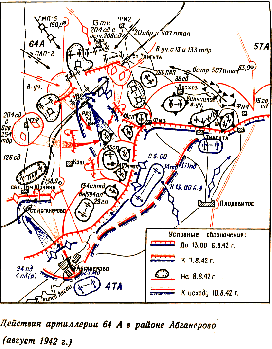 Ну и дополнение. Так сказать первый удар 23.07.42. Расположение артиллерии в полосе 62 А на 20.07 и 7.08.. Кроме того на схему нанесены удары "северной"(8 ак+14 тк) группировки 6 ПА Паулюса от 23.07.42. "Южная" (51 ак+24 тк)группировка начнет наступление, через правый фланг 64 А в направлении Калача 25.07, Но р-н ее наступления ниже Суровикино и не попал в схему Обратите внимание в окружение западнее Верхне-Бузиновка попали части не только 192 сд, но и полк из ПО 33 гв.сд (он отошел в полосу 192 сд) а также части 184 сд, брошеной на локализацию прорыва и 40 тбр. с уважением