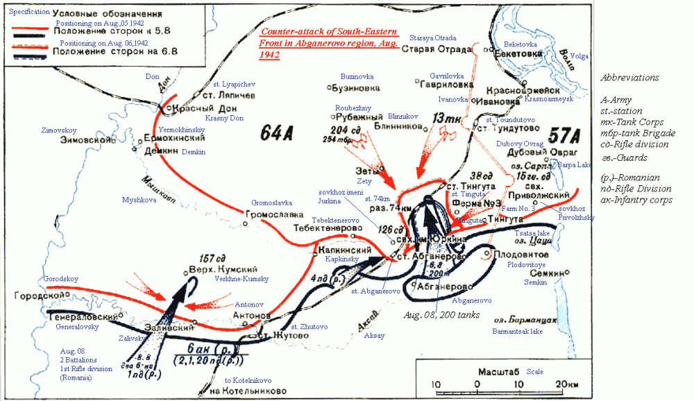 ..Насчет резервов. Общая доктрина ВС Германии с 1914 г -"..Если у вас есть последний батальон, он должен быть брошен в бой чтобы переломить ситуацию". Но у немцев с той же ПМВ было одно преимущество, они как никто другой могли создавать БГ. То есть, им не надо было часто держать большие силы в качестве оперативных резервов. Они легко, беря по батальону или полку в воюющих дивизиях быстро создавали боевую группу, которая и решала задачи оперативного резерва. По сути немцы в обеих мировых войнах, стояли у истоков создания нынешних тактических групп, заточенных под решение конкретной задачи. Дисциплина и выучка войск это им позволяла. Сильнейшее это качество у немцев. Ну не только ошибки лета 42 мы учтем на Курской дуге. Обратите внимание, привычка, или предчувствие у Сталина феноменальные были. Еще не началась Барбароса, а были созданны армии второго стратегического эшелона. Тот же и перед Блау и Сталинградом. Развернуты в тылу ряд резервных армий. Именно их наличие, не позволило ситуации лета 42 г перерасти в катастрофу. На 1.07.42 г они представляли грозную силу. 1 резервная армия 18, 29, 112, 131, 164, 214, 229 сд – – – 1363 осб 2 резервная армия 25 гв., 52, 100, 111, 237, 303 сд – – – 1727 осб 3 резервная армия 107, 159, 161, 167, 193, 195 сд – – – 1305 осб 4 резервная армия 78, 88, 118, 139, 274, 312 сд – – – – 5 резервная армия 14 гв., 1, 127, 153, 197, 203 сд – – – – 6 резервная армия 99, 141, 174, 206, 219, 232, 309 сд – – – – 7 резервная армия 33 гв., 147, 181, 184, 192, 196 сд – – – 1523, 1524 осб 8 резервная армия 64, 120, 221, 231, 308, 315 сд – – – – 9 резервная армия 32, 93, 238, 279, 316 сд – – – – 10 резервная армия 133, 180, 207, 292, 299, 306 сд – – – – 3 танковая армия 154 сд 1172 лап, 62 гв. мп, 470 озадн 12 тк (30, 86, 97 тбр, 13 мсбр), 15 тк (96, 105, 113 тбр, 17 мсбр), 2, 99, 166, 179 тбр – 182 оиб Отдельные соединения и части 2 гв. кк (3 и 4 гв., 20 кд), 6, 7, 8, 10 оибр 1180, 1246, 1247 лап, 151 минп, 72, 74 гв. мп, 68, 69, 77 гв. тмп, 324, 326 огв. мдн 7 тк (3 гв., 62, 87 тбр, 7 мсбр), 18 тк (110, 180, 181 тбр, 18 мсбр), 25 тк (111, 162, 175 тбр, 16 мсбр), 28 одн бронепоездов 222 бад, 50, 127, 156, 183, 192, 249, 271, 291, 437, 517 иап, 9, 134, 136, 261, 275, 279, 511, 624, 779, 780, 803 бап, 622, 671, 766, 893 шап, 598, 600, 638, 690, 701, 702, 765 лбап, 1 рез. авиабригада (644 лбап); 2 рез. авиабригада (32, 205, 507 бап, 621 шап); 3 рез. авиабригада (640 бап) – по сути с 41 г оборонительные обводы готовили, а потом заранее сосредоточили на них 62 А. И ведь не "раздергали" ее на другие направления. Ну вдогонку к ней еще "детское народное творчество" в моем исполнении, что то вроде легенды к нему и ряд схем по Сталинграду. "Первый" удар, силами "северной2 группировки 23.07 и "южной" 25.07. 62-я армия генерал-майора В.Я.Колпакчи -33-я гв. сд, 147, 181, 184-я ,192-я сд, 644, 645, 648, 649, 650-й и 651-й отд. тн.бат, 40-я и 121 -я тн бр. (81 тыс) 64-я армия генерал-лейтенанта В.И.Чуйкова -29, 112, 131, 214-я и 229-я сд, 121 тбр,137 тб 72,8 тыс. чел 21-я армия 278, 300-я и 304-я 21 тыс. чел. Резерв фронта - 18 сд с 133 тбр (четыре роты KB) и 131 сд с 158 тбр (четыре роты KB). В районе Калача располагался 3 гв.кк, который также был в резерве фронта. 1 ТА Москаленко -13-й тк Т.С.Танасчишина 163,166,169 тн.бр (всего 74 T-34 и 49 Т-70) - 28-й тк полковника Г.С. Родина 39,55,56 тн.бр (всего 88 T-34, 60 Т-70 и 30 Т-60) -23-й тк, (формально относился к 4 ТА) 99 тн.бр (17 т-34, 16 т-70),189 тн.бр (26 т-34,16 т-70) , 9 мот (нан. с 204 сд удар по юж.групировке) придана 158 тбр 4 ТА Крюченкин -22-й тк -173 (66/55 тн), 176 (48/29 тн)и 182-я (66/41 тн) тн.бриг (всего 96 T-34, 58 Т-70 и 26 Т-60) придали 131 тн.бр наносил удар 29.07 -18-я и 205 сд Развитие событий (кратко). - 22.07 6 ПА создает две ударные группировки "северную" (8 ак+14 тк) и "южную" (51 ак+24 тк) -23.07 удар "северной" группировки нем