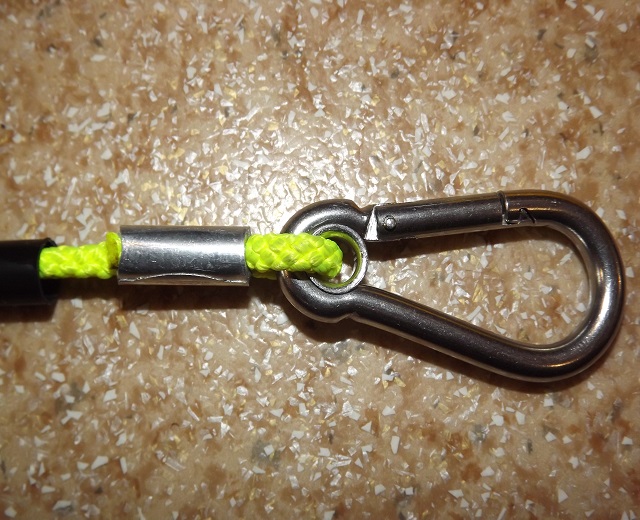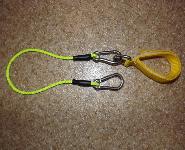 Лот №1. Страховочный шнур, состоит из шнура ярко желтого цвета, длиной 42 см и диаметром 4 мм концы шнура завальцованы металлическими зажимами, двумя карабинами из нержавеющей стали AISI- 316, размером 60х30 мм, а также крепление с застежкой велкро и металлическим кольцом. Можно использовать например как страховочный шнур к лодочному мотору. Цена - 70 грн. Продан