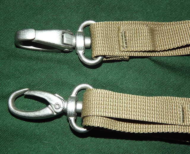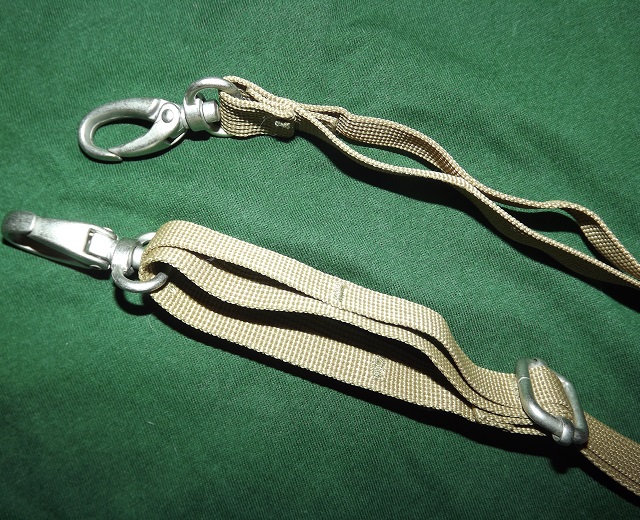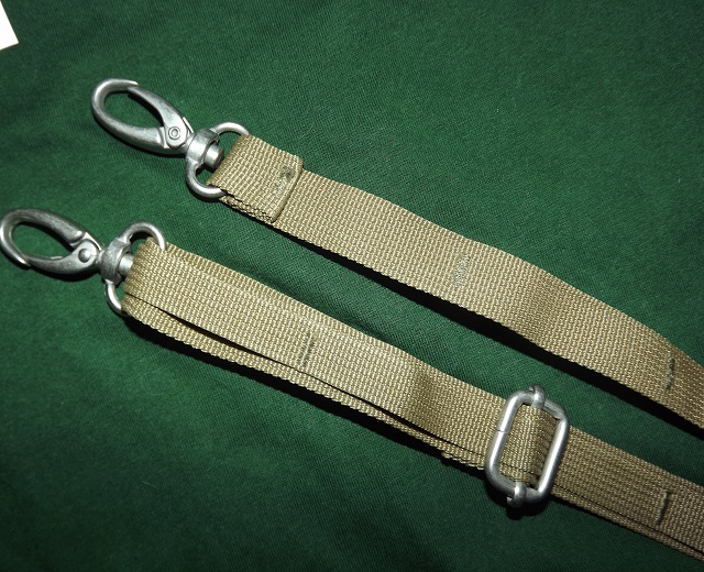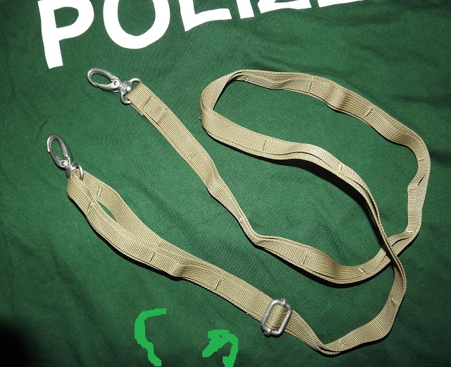Лот №4. Ремешок/стропа (возможно ремешок на сумку) с металлическими карабинами. Состоит из основной стропы шириной 20 мм, поверх которой пришита ( через каждые 60 мм) дополнительная стропа шириной 12 мм. Максимальная длина стропы без карабинов 1370 мм. Цвет койот. Цена - 60 грн.