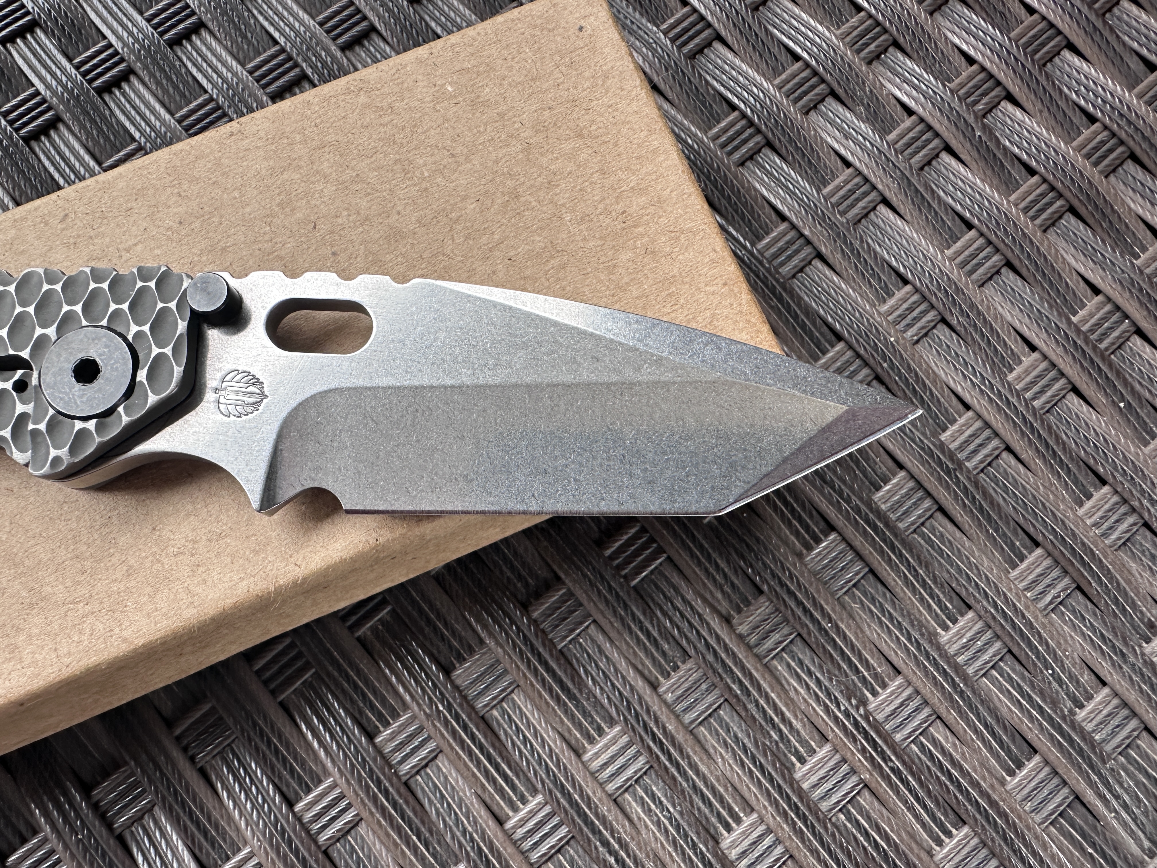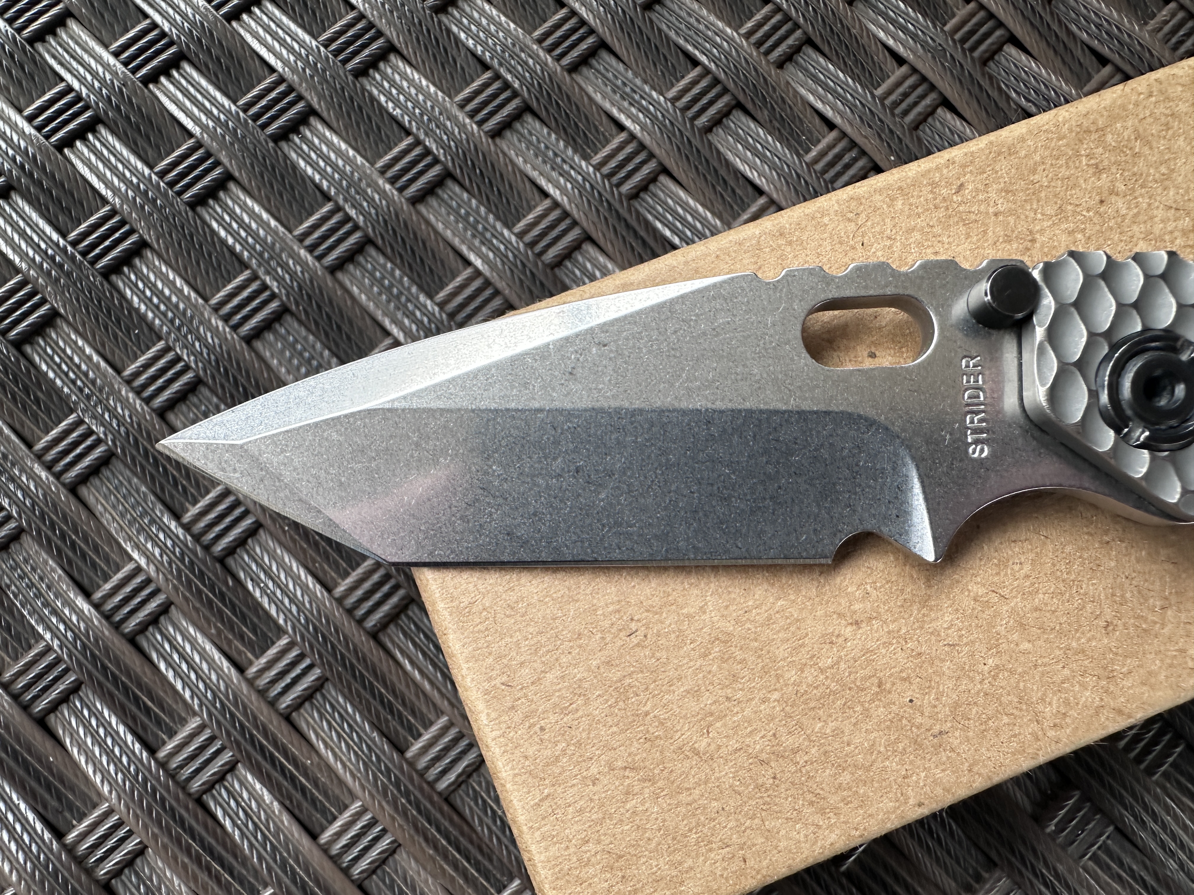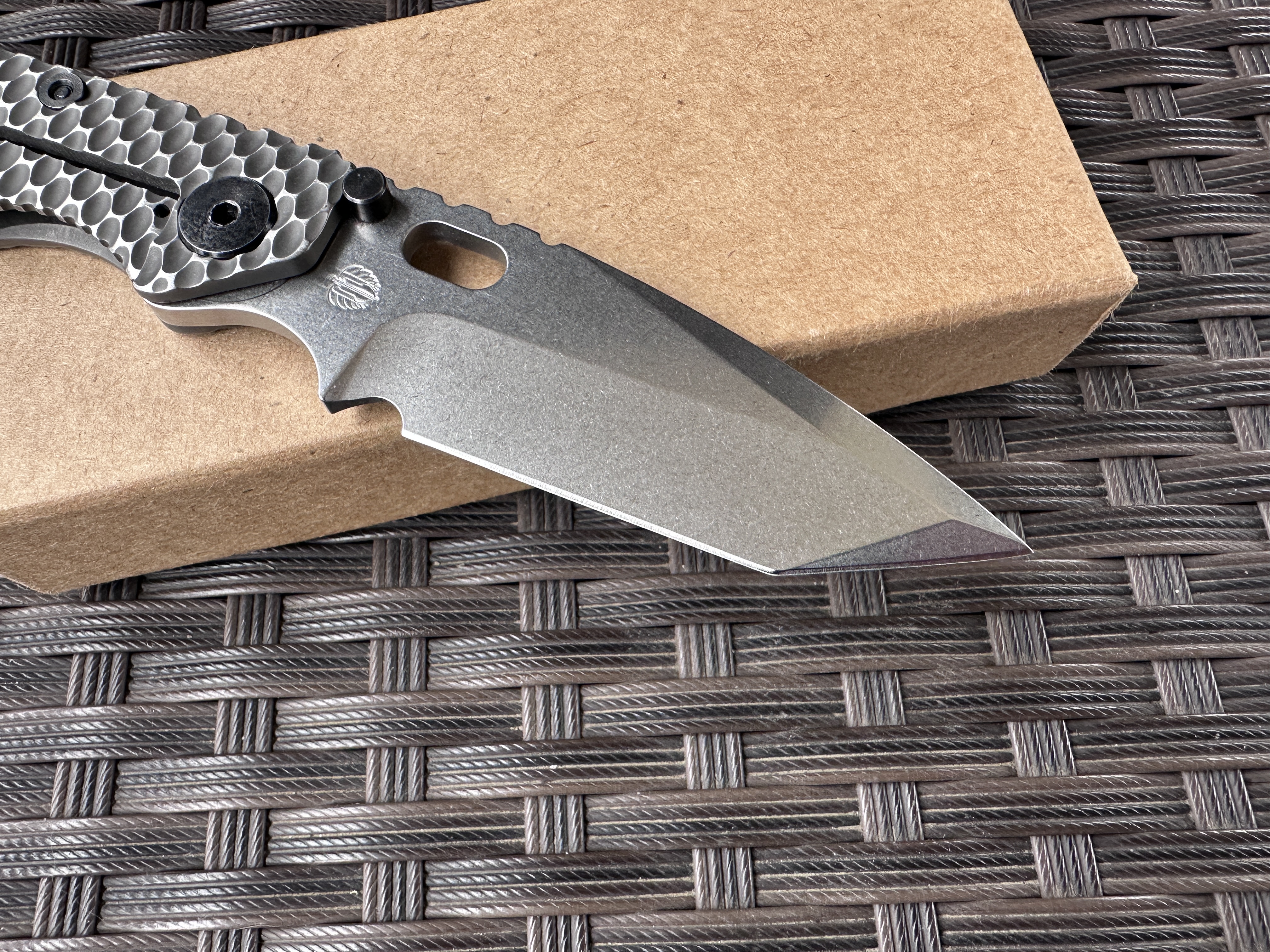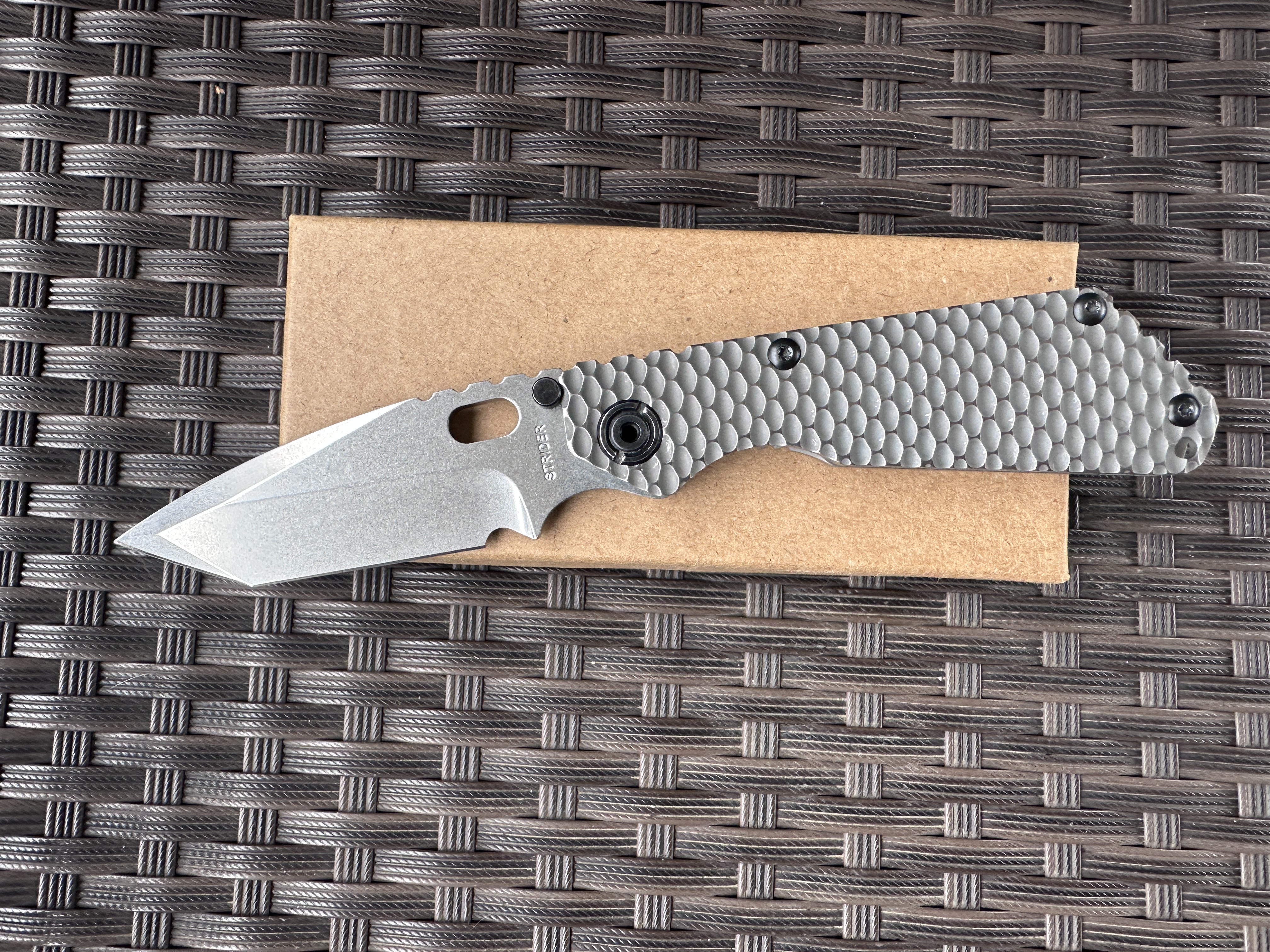 Strider SnG Tanto Ti/Ti Хорошая б/у реплика на клинке D2, нож тяжелой работы не видел клинок без царапин но заточку требуют. Нож разбирался смазывался Крис Рива смазкой. По плашкам проводилась обработка для сглаживания сот, чтоб не ел карман. Механика отличная клин падает под своим весом, люфтов нет, клин по центру. Отличный ломик для любой работы. Цена: 3400 грн. Условное б/у, оценка 9/10 Оплата по договору, пересылка за счет покупателя! Характеристики: Общая длина: 208 мм Длина клинка: 92 мм Обух: 4 мм Материал клинка: D2 Финиш клинка: Stonewash Рукоять: Titanium/Titanium Замок: Frame Lock Осевой узел: шайбы Вес: 146 г