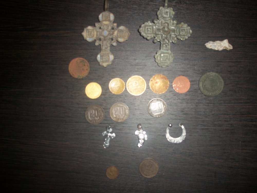 Ребята копали крестики,монетки, - я же копал только метал с глубины(благо успел купить фискарика))),потом собрались показать кто что выкопал-подсказали по регулировкам, и до вечера я немного начал понимать-слушать прибор))))- выкопал пуговку-гирьку и советы 20 коп.и 5 коп.1931г.