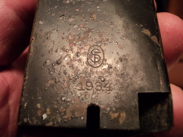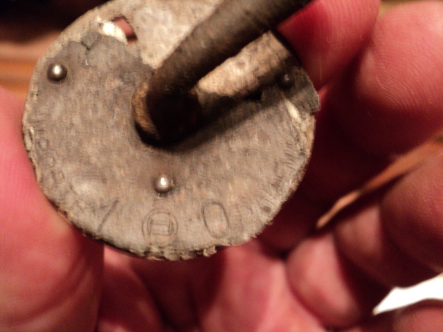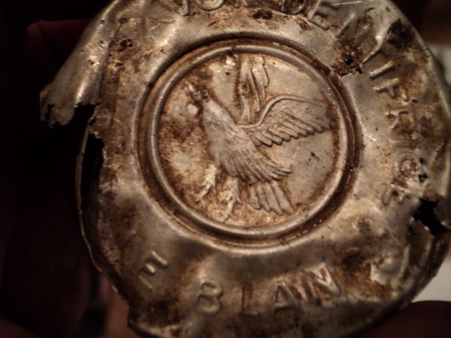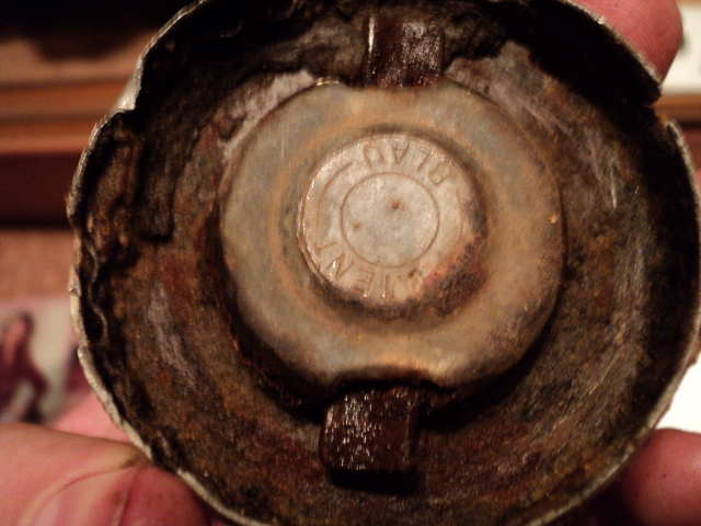Вот из проблемного, в смысле определения, попалось сегодня в лесу. Какой то латунный параллелепипед с окошком и клеймом 1934 года. Наверное закрывал радиолампу. Клеймо в овале буквы S и F. Сименс? Круглая алюминиевая коробочка то ли от крема, то ли от пудры с птичкой и надписями SAVON DENTIFRICE и LE BLAN (это что осталось). Потом крышка непонятно от чего с надписями BLAU и PANENT. Мятый алюминиевый конус с резьбой внутри. Скорее всего колпак от снаряда. Длинный винт на цинке остатки надписи, крепился на бакелит. Возможно от радио,т.к. в той же землянке найдено сопротивление на 600 Ом с немецкой маркировкой.И кожух бошевского двигателя от дворников. Хотел обжечь в костре, но алюминий стал расплавился, поэтому спас только малый кусок с надписями. Надпись BOSCH сгорела. Еще круглый замок без душки и хомутик от какого-то оружия.