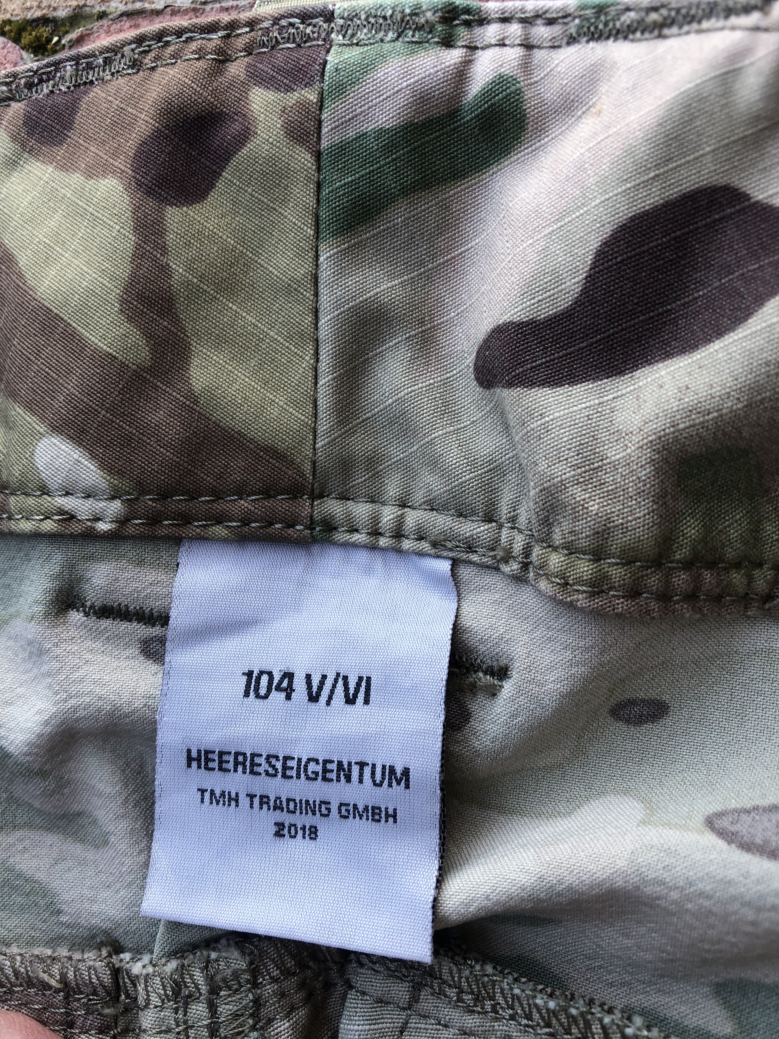 Штаны камуфляж Бундесхер, шестицветка 1500 Министерство обороны Австрии объявило в сентябре 2017 года, что весь бундесхер в конечном итоге будет одет в новую форму с уникальным австрийским камуфляжным узором. Этот камуфляжный дизайн сочетает в себе шесть цветов (серый, темно-оливковый, средний оливковый, лишайный зеленый, хаки и песок) в пестром узоре, который предназначен для воспроизведения типа местной растительности, найденной в Австрии. Шаблон также включает в себя функции, предназначенные для предотвращения ночного зрения. Этот дизайн не был основан на шаблонах, ранее протестированных Jagdkommando, которые в конечном итоге были отменены. Это подразделение также будет носить новую камуфляжную схему, со специализированной униформой, имеющей конструктивные особенности, предназначенные для специальных операций. Начиная с 2019 года, персонал, обслуживающий в чрезвычайно засушливом климате, был оснащен пустынным камуфляжным узором только в четырех цветах (очень темно-коричневый, серый, хаки и очень светлый песок) в "цифровом" или пиксилированном формате. Униформа в узоре Tarndruck neu была впервые представлена Jägerbataillon 18 (18-й пехотный батальон) и Milizjägerbataillon Burgenland (батальон милиции Бургенленда) в марте 2019 года.