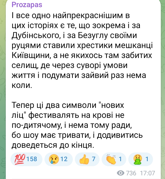 І все одно найпрекраснішим в цих історіях є те, що зокрема і за Дубінського, і за Безуглу своїми руцями ставили хрестики мешканці Київщини, а не якихось там забитих селищ, де через суворі умови життя і подумати зайвий раз нема коли. Тепер ці два символи "нових ліц" фестивалять на крові не по-дитячому, і нема тому ради, бо шоу має тривати, і додивитись доведеться до кінця. (с)