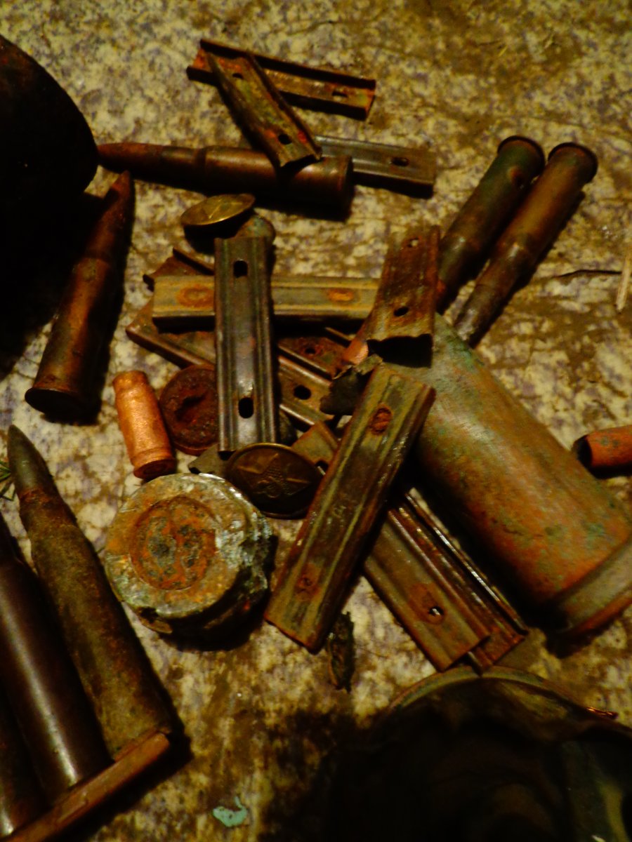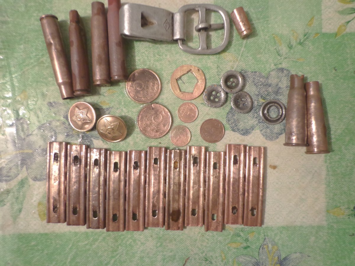 Т.к. времени было не обильно, пройдя не много по лесу, накопали около 20кг. металлолома, не много пуль, маленькое зубило) лом), магазин с маузера на 30 патронов (но почти полностью протрухший), 2коп ссср 1957г.в., и многое другое не попавшее на фото, т.к. с другим пакетом попало домой, а не в гараж)), и не понятная деталь, если кто знает что это - расскажите (на последних фото)