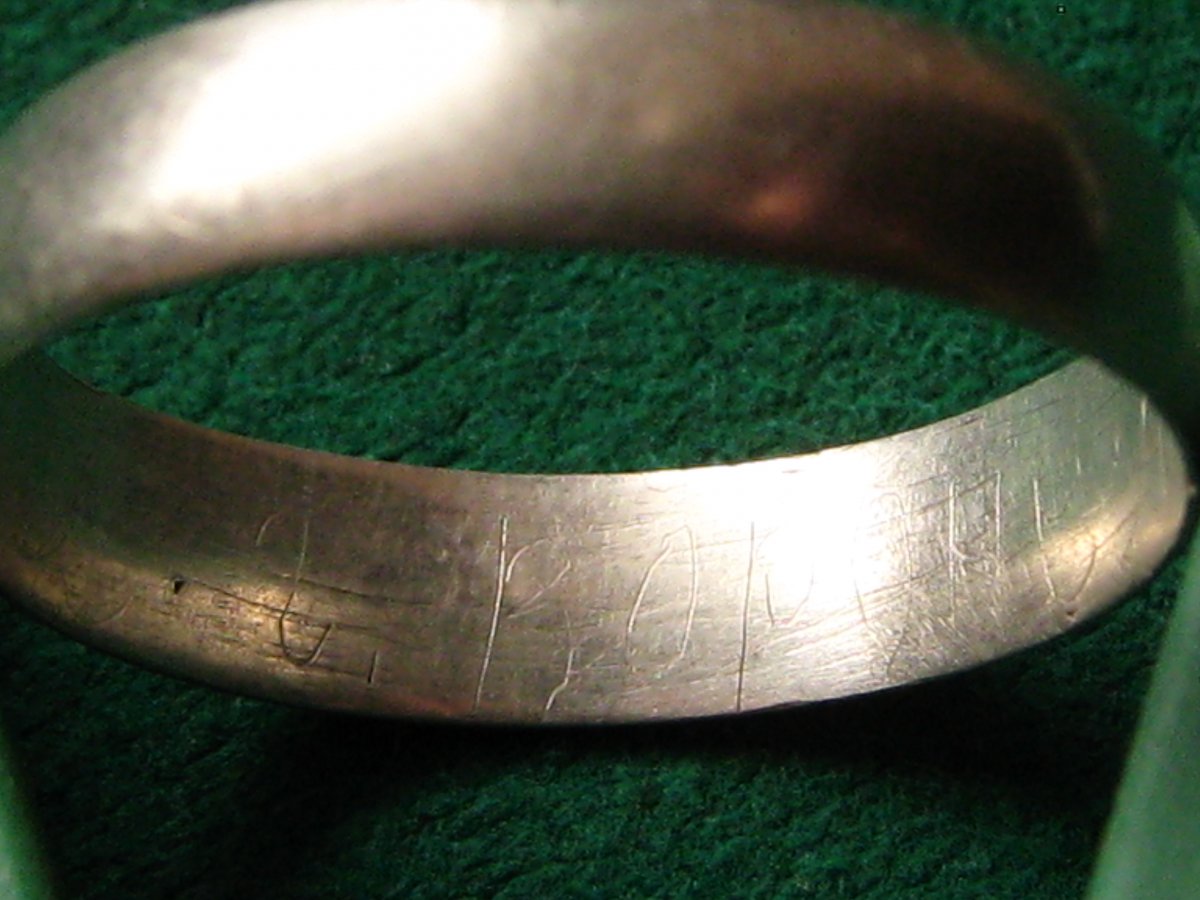 Доброго времени суток, землячки. Хочется поделится крайней находкой с передовых немецких позиций, где вела наступление 38-я армия Воронежского фронта. Эти позиции штурмовали долго, но так и не смогли их взять. Немцы отошли сами, что-бы не попасть в кольцо. Не дает покоя мне колечко, вроде-бы обычное, серебряное, без клейма,сделано кустарным способом с монеты, находится таких полно особенно на хуторах. Но это с надписью " Костя г. Воронеж". Интересно, где этот Костя, жив-ли остался после этого боя? С уважением.Юрий.