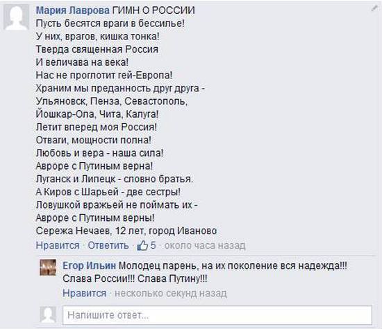 Ось непоганий гімн рашн троллів: Они давно посеяли вражду, Стреляя ложью, как из пистолета, Справляя бесконечную нужду И под себя и в бездну интернета! Их монитор широк, а разум мал, Они храбры в сети, но в жизни робки, Поскольку кал — везде и всюду кал, В любой гламурной сумке и коробке! Их лица далеки от похудений, А мир стыда и совести — убогий. Ценители питейных заведений И пациенты центров наркологий! Их паства – мусора и куртизанки, А пастухи-развратники и геи. Безродные плебеи и подранки, Рабы, холопы, слуги и лакеи! Их жизнь застыла в пустоте страстей, А смерть спешит из города и леса, Проклятие над низменною фауной «ботпресса»!