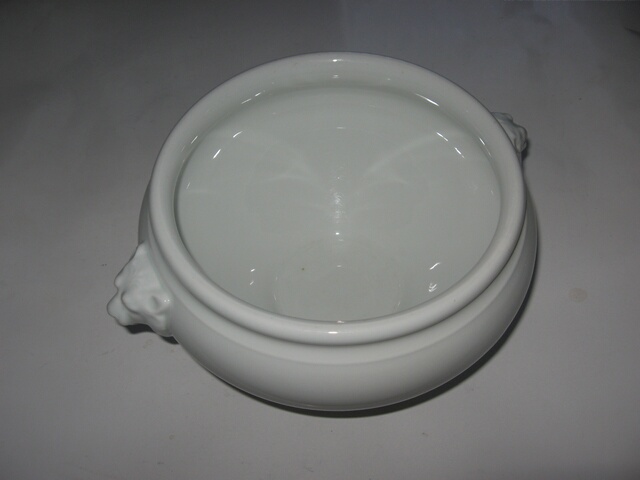 Классическая супница из массивного белого фарфора с ручками в виде львиных голов. Принадлежала одной из офицерских столовых Вермахт, очем свидетельствует клеймо на ее донышке. Там же находится и клеймо фирмы-изготовителя: "Rosen - thal, 1941". Все клейма подглазурные, предмет в очень хорошей сохранности.
