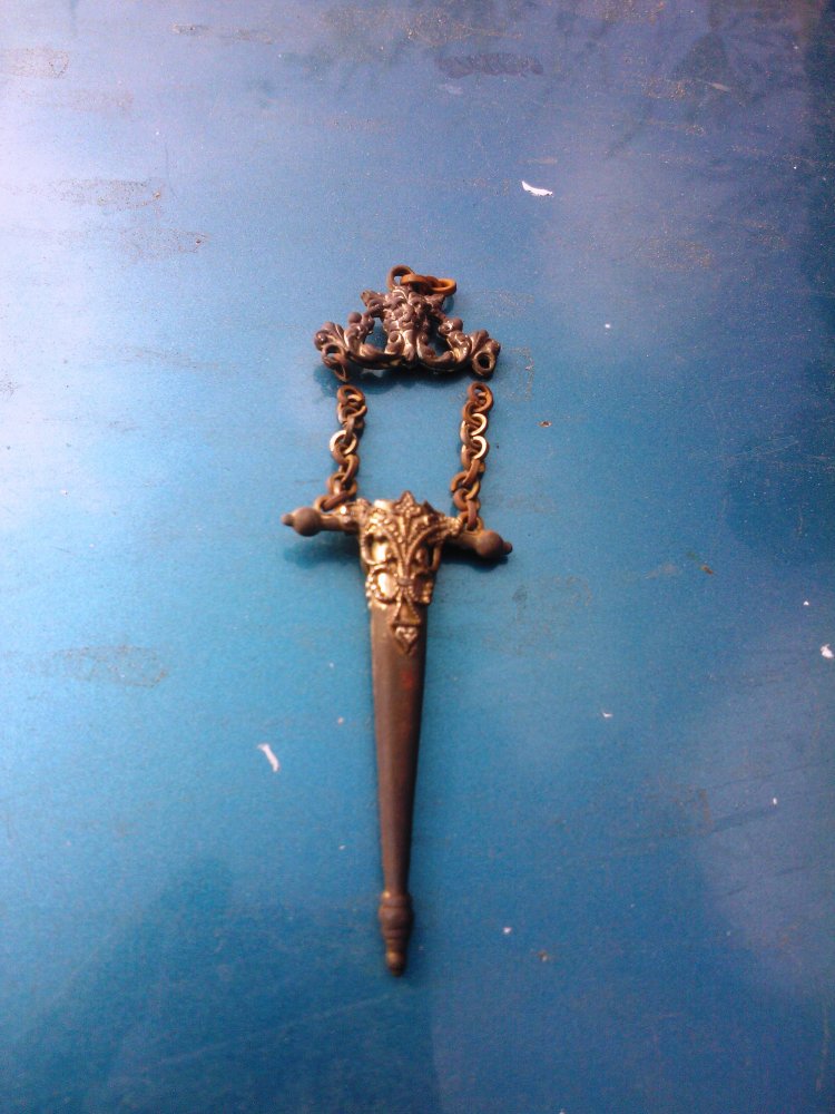 Да, современный сувенир. Подобные изделия можно посмотреть, набрав в поисковике "подвеска кинжал (меч) в ножнах". Лет 10 тому назад дочери один юноша подарил на ДР такую штучку из серебра с красным камешком. Носится на цепочке на шее. Когда летели из Праги, молодой парень на контроле в аэропорту чуть до слез не довел дочку, прикопавшись (конечно, из любви к хорошеньким девушкам) к подарку, как к якобы холодному оружию, запрещенному к провозу в салоне самолета. Чех отстал, когда за спиной дочки выросла моя внушительная фигура, увенчанная офицерской мордой с соответствующим выражением охвативших меня отцовских чувств. Честь имею!