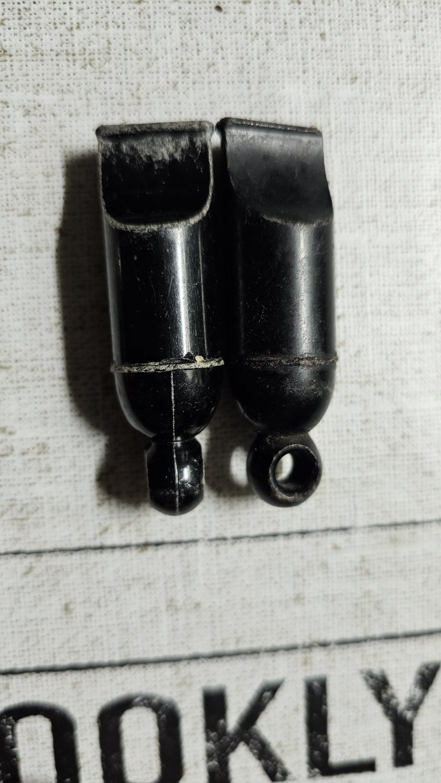 Всем привет. Есть версия,что остался от солдат Вермахта. Материал - бакелит или карболит, коричневый, шарик - деревяный. Рядом, для сравнения - современный,из чёрного пластика и пластиковым шариком.