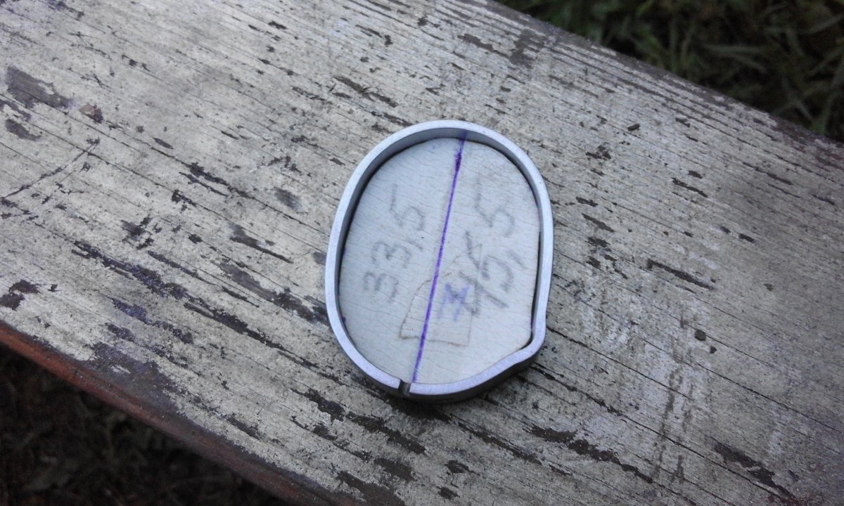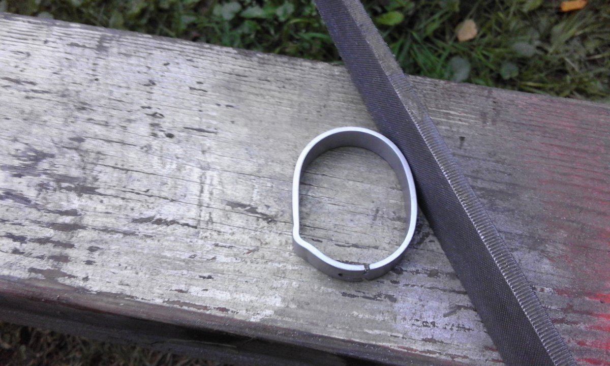 После снятия с колца лишнего металла, колцо раскрылось на 1мм примерно. Похоже чуть снято напряжение металла. Устраняется легко. Перед закалкой стяну проволочкой, нагрею и в масло, всё станет как надо.