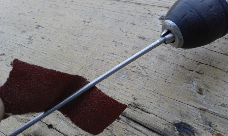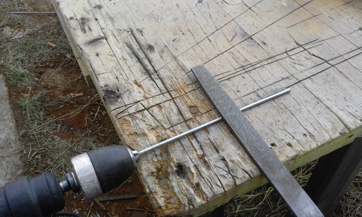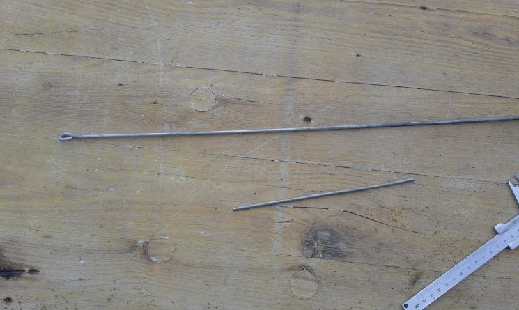 Взялся за антабку. База останется от СВТ 40, кольцо переделал правильное. Для работы взял пруток 4 мм (больше ничего подходящего под рукой не было). На дрели напильником проточил до 3.5 мм, поправил наждачкой, сделал контрольный замер. Пруток для дальнейшей работы готов.