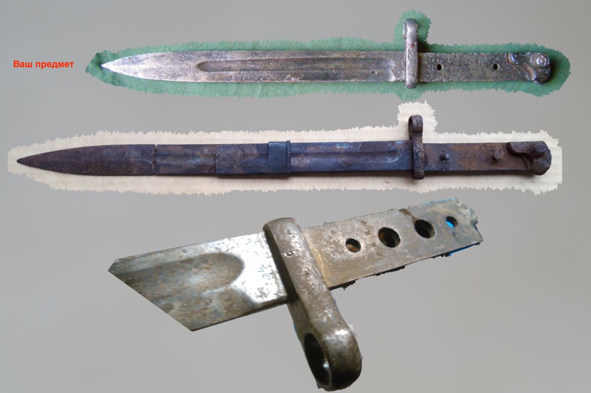 Уважаемый «Doktor 103», то что вы не обнаружили ни какого клеймения на штыке – это возможно. Постараюсь высказать своё мнение псевдоэксперта, надеюсь коллекционеры «голубых ножей» после этого меня не облаят. За достаточно короткий промежуток времени 39 – 40-ой года, как винтовка так и штык к ней прошли достаточно много этапов модернизации. Если производство винтовок СВТ38 / СВТ40 было запущено на Тульском и Ижевском оружейных заводах, то штык-ножи к ним производились и на других предприятиях. Естественно производители маркировали свои изделия фирменными клеймами и номерами. В зависимости от производителя и периода производства клейма наносились на пяту клинка, боковую поверхность крестовины и даже щёчку рукояти. Поэтому то что вы не обнаружили клейм на вашем штыке, это нормальное явление. Далее по поводу больших отверстий на хвостовике. Известно что буквально за очень короткое время использования винтовки СВТ38 были выявлены недостатки в её использовании, в связи с чем было принято решение о модернизации. Естественно модернизацию терпели и штыки. Одна из главных задач модернизации было уменьшение размеров и веса. Я приведу вам в пример копаный предмет СВТ38 у которого нет больших отверстий в хвостовике. Ваш предмет по ряду видимых признаков я бы отнёс к позднему производству (режущая кромка лезвия находится от кольца крестовины, имеется предохранительный буртик кнопки). Ранние штыки СВТ40 имели практически одинаковые детали с СВТ38, за исключением длинны клинка и веса. В последствии это всё было доработано. Поэтому моё мнение что ваш предмет это итог многих модернизаций за короткий промежуток времени, плюс повторюсь что штыки по мимо Тулы и Ижевска выпускались ещё другими предприятиями. Всё что я вам аписал, это сугубо лично моё мнение не претендующее на звание эксперта данного форума! С уважением...........