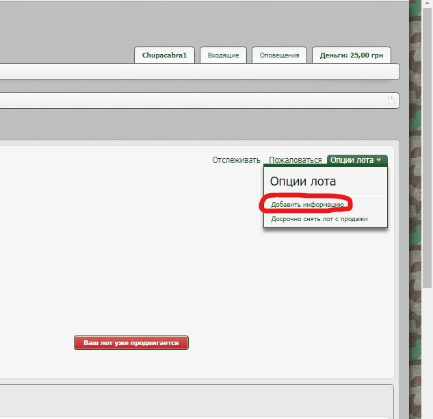 Добрый вечер, чтобы загрузить дополнительные фото, вам необходимо перейти на свой лот, щелкнуть "опции лота" Далее, нажать "загрузить файл", загружаете нужные вам фото, далее, в текстовом поле введите, что посчитаете нужным и нажмите "добавить информацию". Все должно получиться. С Ув.