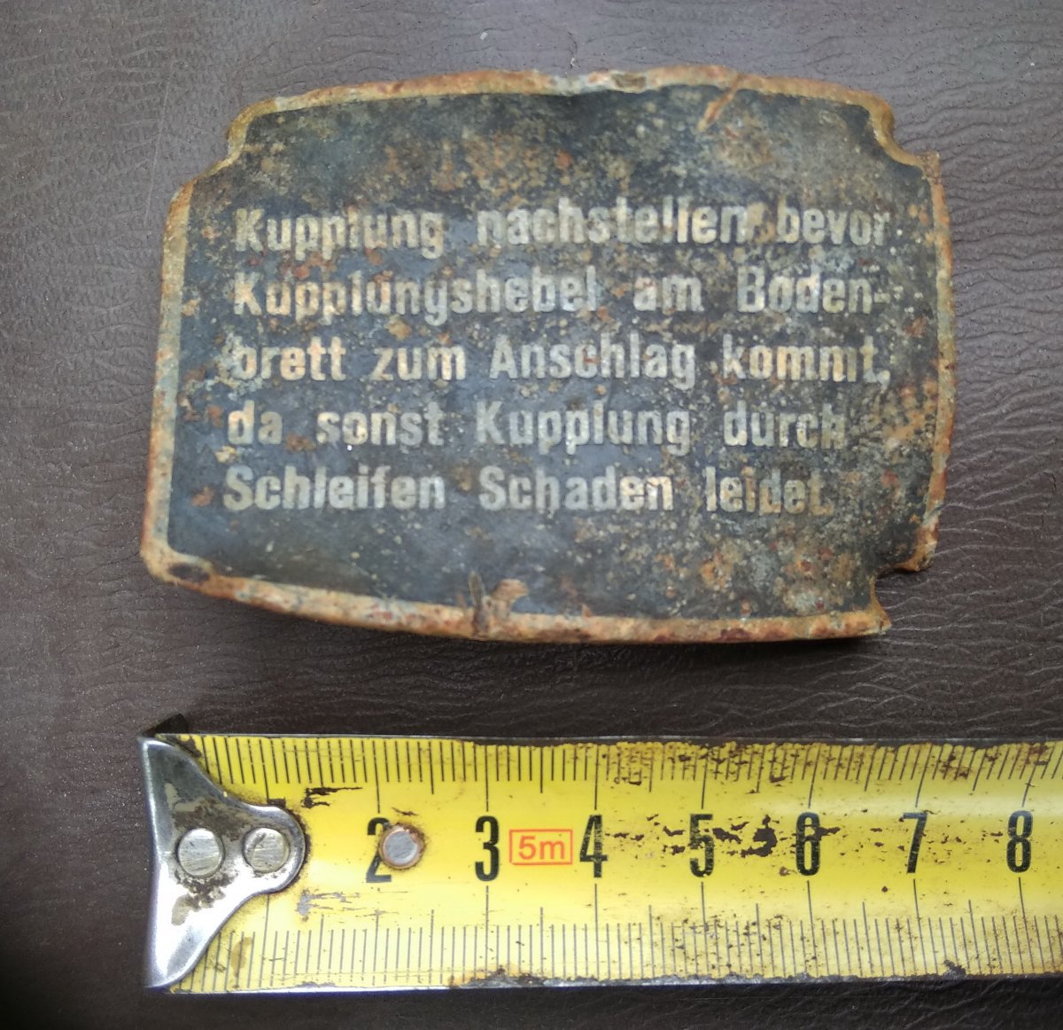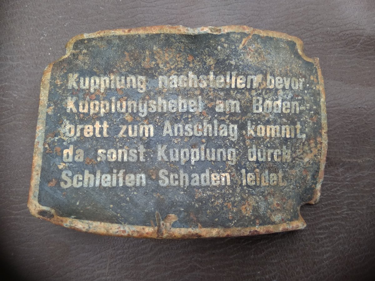 Добрый вечер, уважаемые форумчане! Попалась вот такая табличка (бронза или латунь) с текстом: Kupplung nachstellen bevor Kupplungshebel am bodenbrett zum Anschlag kommt da sonst Kupplung durch Schleifen Schaben leidet Я перевел его как: Отрегулируйте муфту до того, как рычаг сцепления на нижней доске дойдет до упора, иначе муфта будет страдать от износа. В сети на Лейбштандарт нашёл инфу, что это - ТАБЛИЧКА ДЛЯ РЕГУЛИРОВКИ СЦЕПЛЕНИЯ НА 8-МИ ТОННЫЕ ТЯГАЧИ. Кто в технике немецкой разбирается, о какой конкретно модели тягача идёт речь?