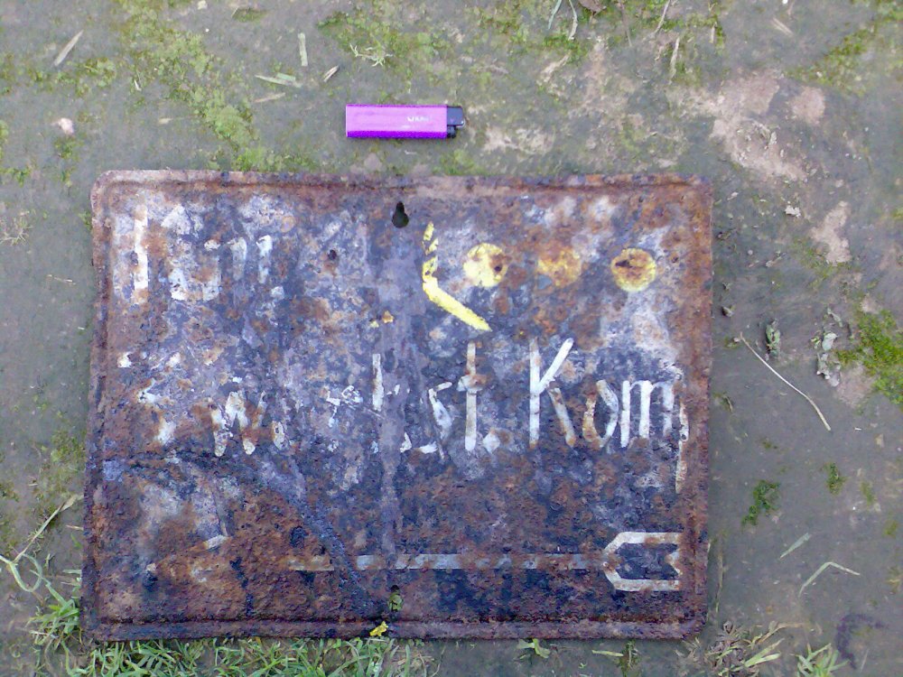 Уважаемые Форумчане! Может кто предположет, куда и кого посылает стрелка на табличке. Поднята с глубины сантиметров 50. (сопутки: Нем. копейки, пуговки). Извините за фото, как есть и что осталось! С Уваж!