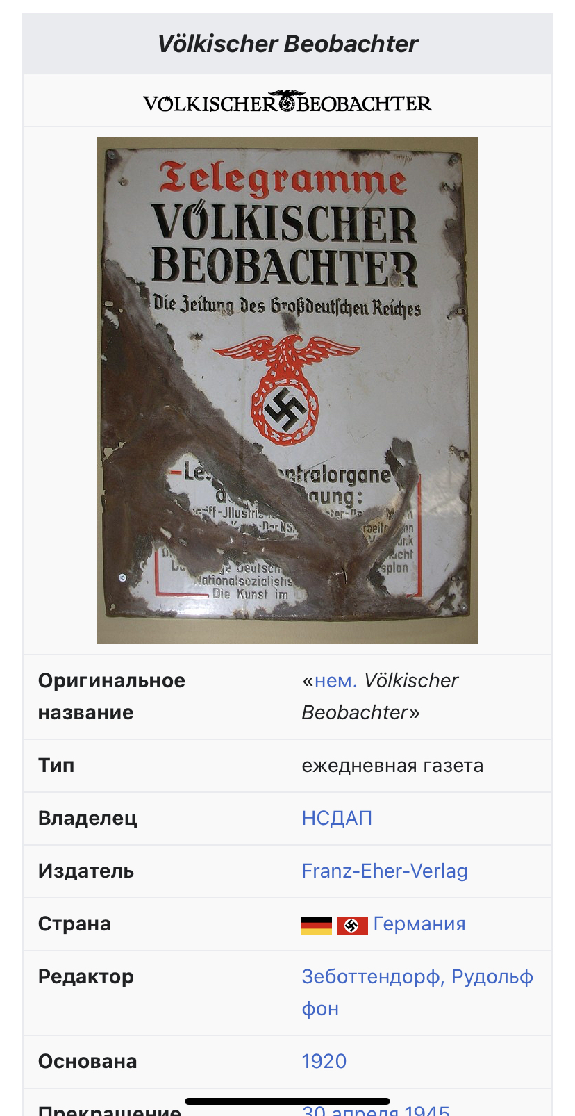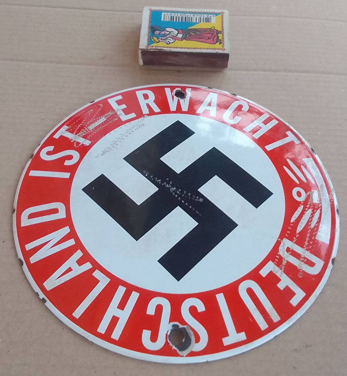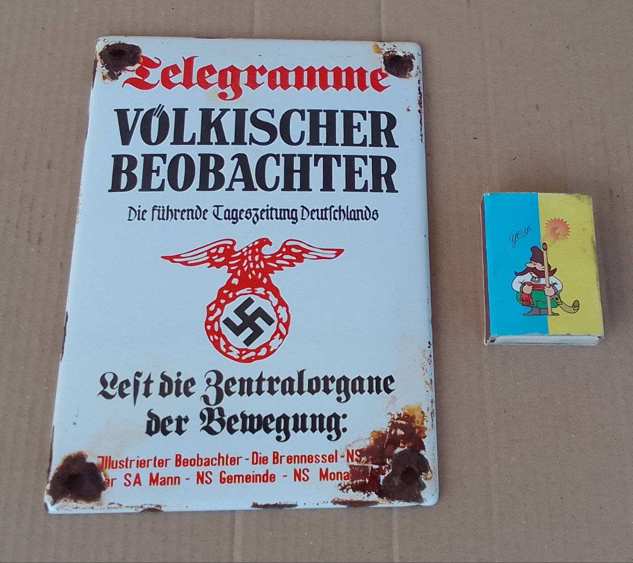 Всем привет. Достались две отаких таблички. Сперва думал - фуфло, уж больно яркие, но нашел проходы аналогичных как оригиналов. Ссылки на проходы: https://www.team-militaria.de/Emailleschild-VOeLKISCHER-BEOBACHTER-EXTREM-SELTEN https://rheinland-militaria.com/products/rare-metal-sign-enameled-volkischer-beobachter https://privatecollections.ca/WW2-g...ap-deutschland-erwacht-1933-metal-wall-pane-0 Европейский ценник в 300 долларов за единицу я признаю в наших реалиях неприменимым, интересно, сколько потянет у нас.