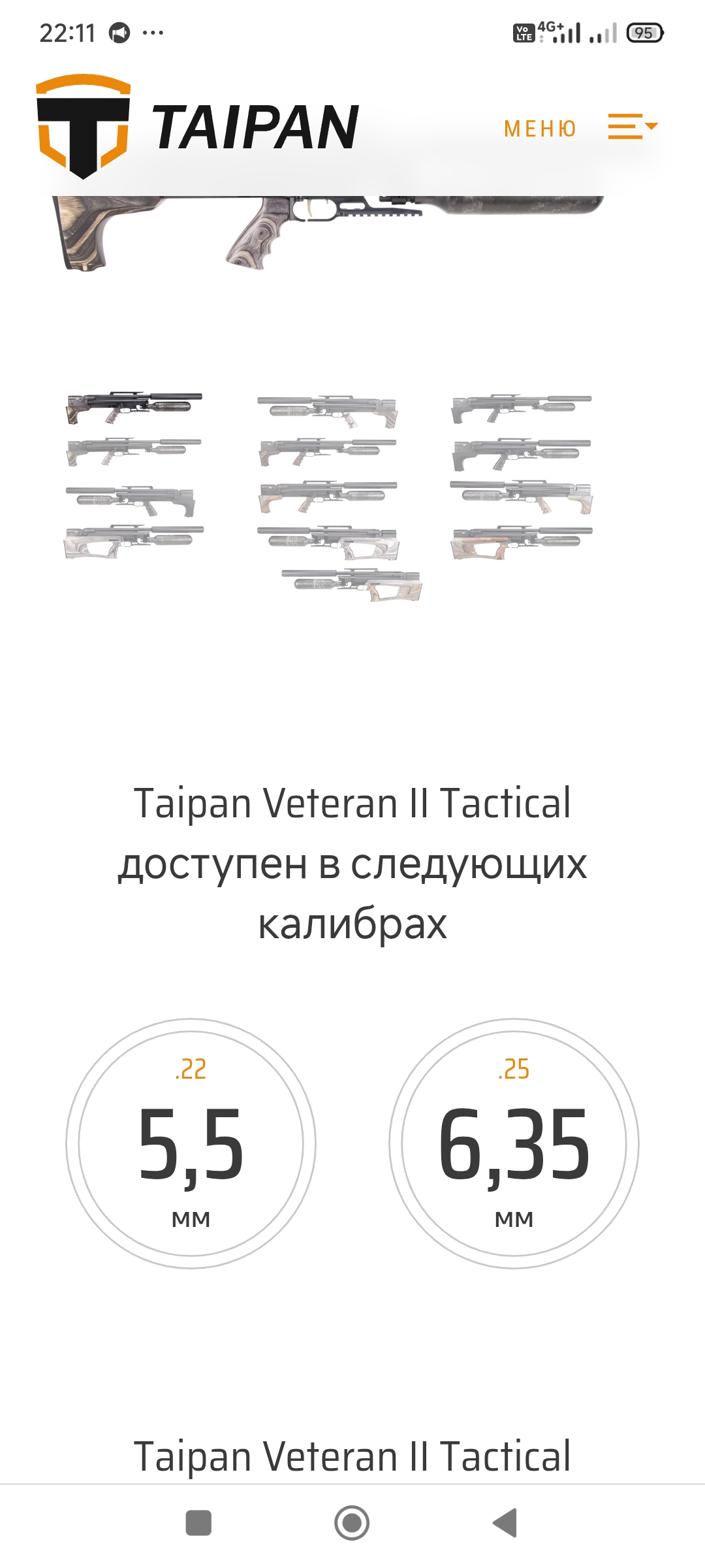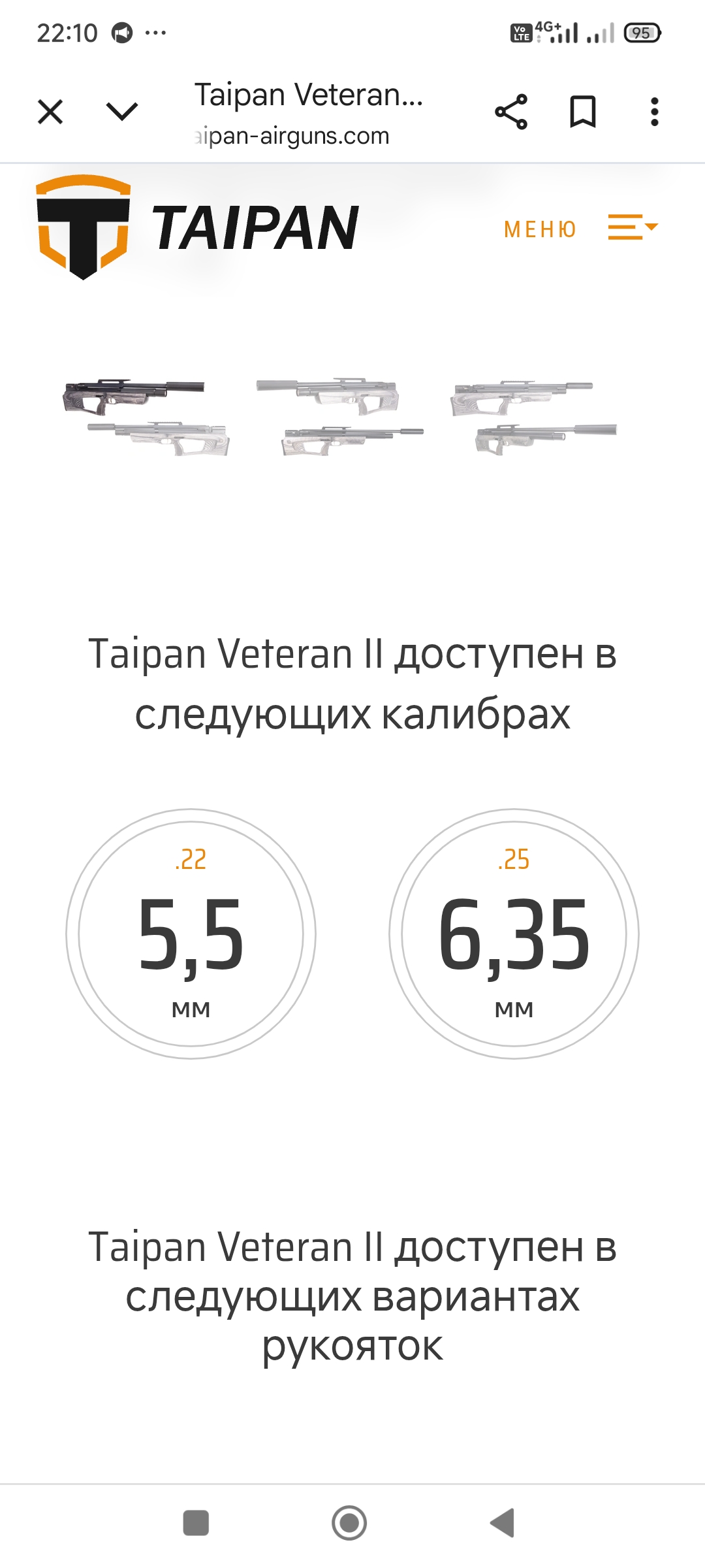Уважно читайте оф сайт. Поглибленно. Гугл-перекладач прекрасно справляється з перекладом. https://www.taipan-airguns.com/rifles/taipan-veteran-ii Я даю посилання на офіційний сайт. А ваше посилання на медіа.. media.graphasset. Якби рекламний буклет. Що не є офіційною позицією taipan-airguns. Оф сайт Тайпана - https://www.taipan-airguns.com/ Спробуйте на оф сайті знайти інфу по калібрам. Посилання на рекламний проспект в жовтій пресі - тільки реклама, не більше. Користуйтесь офіціальними сайтами. Там пишуть за наявність калібрів. Зараз. В реальному часі. І у дистриб'юторів теж нема .177 Чому?