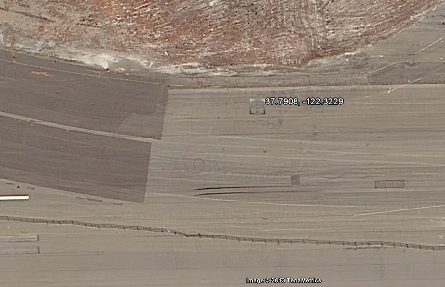 Похоже Wikimapia ( достойное описание карт Google) даёт ответ на происхожение самолёта. ВПП заброшена, там снимаются кинушки, гоняют дрифтеры, работают "Разрушители легенд" и пр. http://wikimapia.org/#lang=ru&lat=37.791744&lon=-122.319460&z=16&m=b
