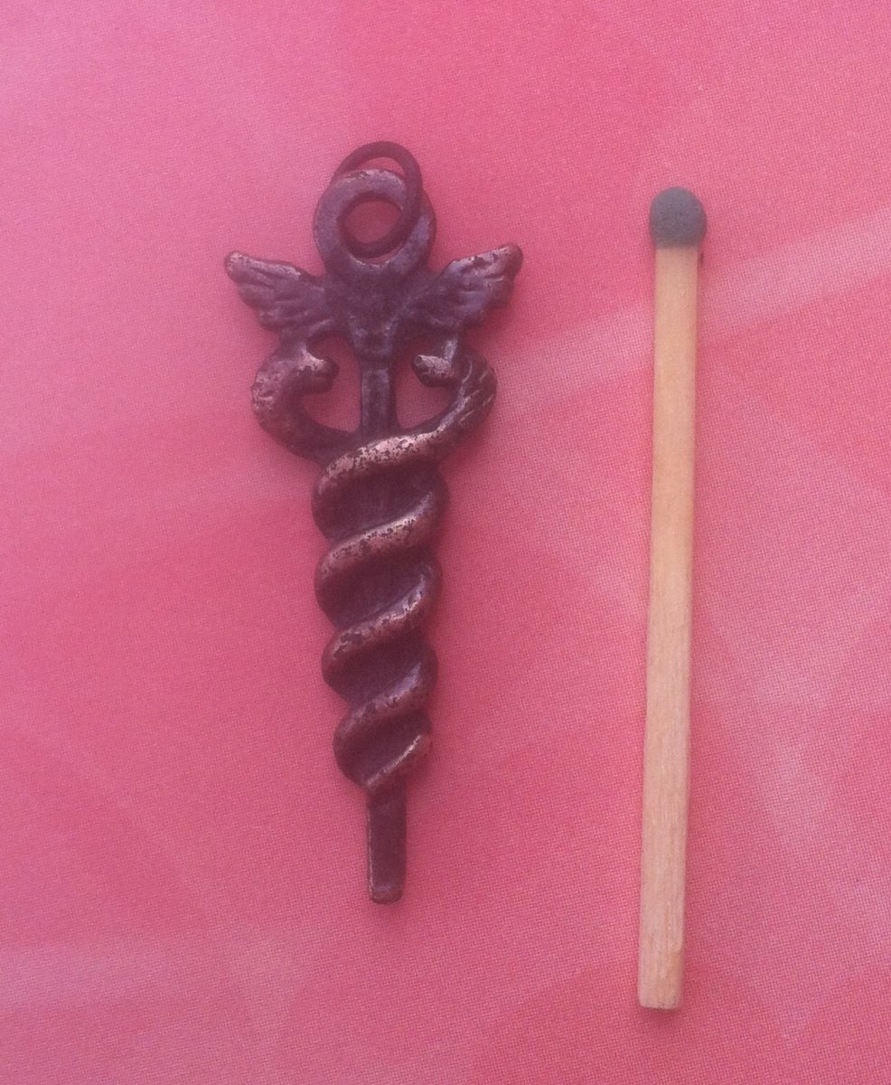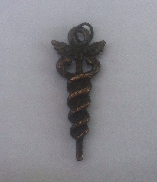 Помогите определить и оценить нагрудный знак (медальон) Кадуций. Был найден предположително на месте таможни времен правления Российской Империи. Также, неподалеку была найдена таможенная пломба пломба 1893 года.