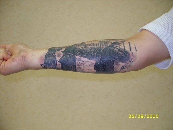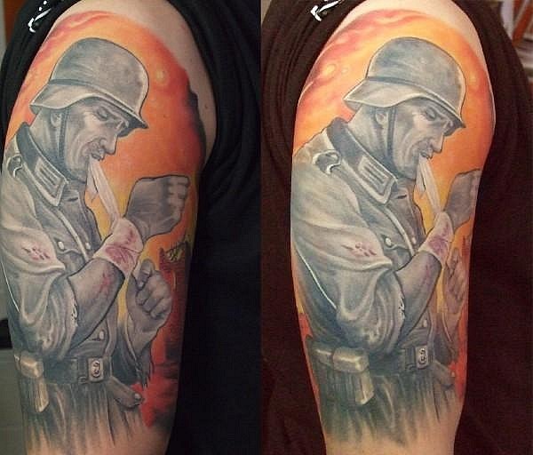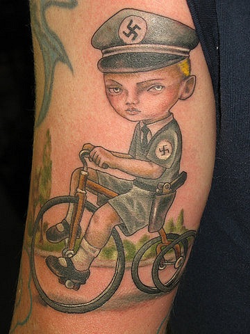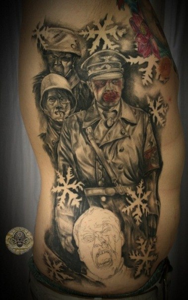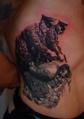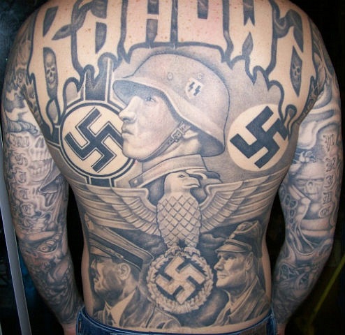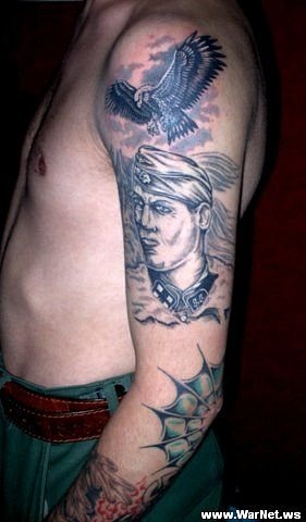 здравствуйте ув. камерады хочу тоже вставить свои 5коп в тему и так по порядку: по поводу татту работ мастера (которые в цвете) я восхищаюсь этой работой такие картинки довольно сложно сделать я допустим такого уровня ещё не достиг, если говорить о фанатах которые бьют себе такие весчи то здесь я вижу практически на всех фото скинхедов а такие люди татухами не светятся т-к можно попасть под раздачу ибо милиция нас бережёт или на чурок в подворотне наткнуться можно (видал я гдето одно видео как в россии пацанчика молодого пресуют упыри кавказские только потому что на нём стилы на ногах и лысый, кстати фильм один вспомнился про скинов рекомендую американская история Х мне понравился) ну а простой люд такое бить не станет, вы ещё не видели что наши националисты носят, у нас портрет бандеры можно встретить в россии и ленина и царя батюшку, что правда не только националисты вождей колют и зеки портретами ильича не брезгуют, там значение какоито есть, подзабыл. расскажу вам забавную историю: давно это было пацанва есчё зелёная, шли мы както по городу и встретился нам какоето чучело и давай по фени базарить мол погоняло моё адольф при этом демонстрируя татуху на груди фюрера да я афтаритет и всё такое короче просил денег а у нас их тупо небыло вообщем погрузил дядя нас есчё чуток и пошёл дальше лохов искать это потом я узнал что значит отсувствие у него всех четырёх передних зубов и как и для чего это делается. ну а фанаты это дело житейское у нас демократия что хочу то и делаю. по поводу фоток с растрелом, можите считать меня суеверным но такое произвидение хозяину только проблемы принесут кстати тут встречаются с юмористической тематикой так что каждому своё да и вообще чем эти люди отличаются от нас с вами у каждого есть свой взгляд на увлечения и красоту возьмём даже малолетних шм...к которые делают сердечко на опе а н-ра ? шоб було. об тату несуществовавших которые сс-овцы носили времён войны, читал я в мемуарах не помню кого как автор ходил по переправе в черте города после боя и там повсюду валялись трупы солдат сс с дыркой в виске так он со своими бойцами осматривал трупы для идентификации не только по документам но и по нательным признакам татту и ранения так быть может те картинки которые мы имеем здесь это тоже срисованные с трупов для архивов а вспомните немецких офицеров которые коллекционирывали куски кожи с татуировками пленных из лагерей не все же зверями были некоторые просто срисовывали себе в альбомы
