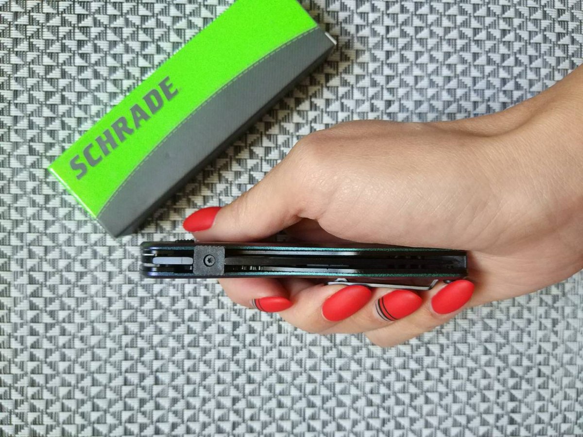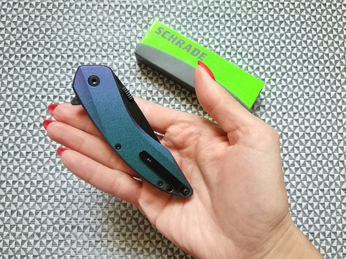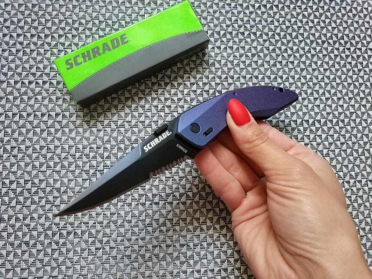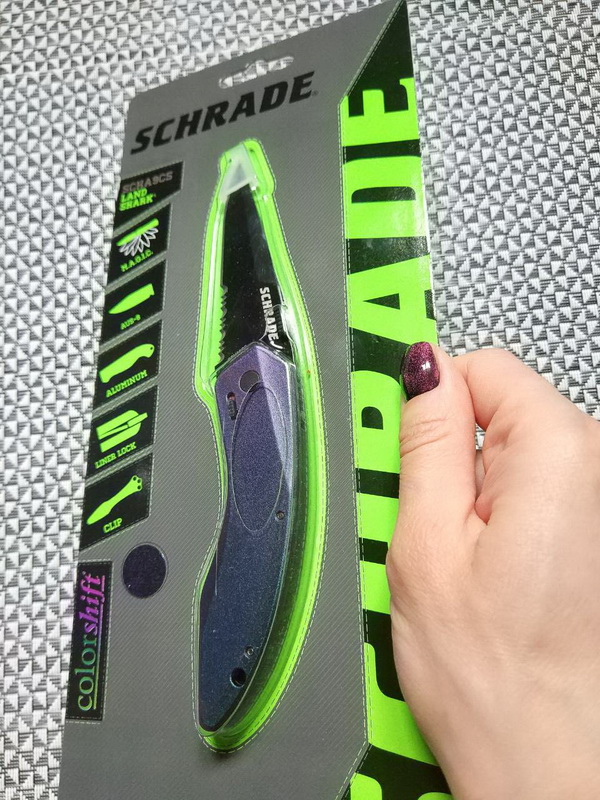 Предлагаю складной нож от компании Taylor Brands LLC (Schrade). Модель SCHA9CS Land Shark. Оригинал. Компания Schrade широко известна на ножевом рынке и имеет довольно долгую и разнообразную историю развития (которую мы уже более подробно рассматривали в других темах с ножами этой компании). На данный момент активы и интеллектуальная собственность корпорации находятся по договору в управление компании Taylor Brands LLC. Главный офис Taylor Brands LLC располагается в городе Кингспорт (штат Теннесси, США). Продукция современного бренда Schrade — это складные ножи для EDC, тактические модели и мультитулы, линейка моделей полуавтоматических и выкидных фолдеров (мало кто знает и помнит, но компания была одним из «пионеров» в этом сегменте и ей до сих пор принадлежит целая серия патентов в этой сфере). Также компания выпускает тактические фикседы, «внедорожные» модели и мачете. Теперь же перейдем непосредственно к модели SCHA9CS Land Shark. Этот нож как раз и относится к «семейству» полуавтоматических EDC (Every Day Carry) ножей. Компактных, легких и готовых быть всегда под рукой. Клинок - вариация «на тему» Clip Point, с комбинированной, полусеррейторной заточкой, изготовлен из стали AUS-8. Эта японская сталь обладает хорошим соотношением эксплуатационных характеристик к стоимости и используется очень многими производителями. Сталь AUS-8 отличается неприхотливостью, пластичностью и стойкостью к ударным нагрузкам – то, что нужно рабочему EDC ножу. Финишное покрытие клинка - black-oxide coating. Механизм открытия - запатентованный механизм M.A.G.I.C. (Multipurpose Assisted Generational Innovative Cutlery). Нож можно открыть либо нажатием на рычажок, расположенный на спинке рукояти, либо толчком по пластине («таблетке») расположенной на обухе клинка (она же служит удобным упором для большого пальца, когда нож открыт), а дальше открытие произойдет автоматически при помощи пружины. Система так же оборудована ручным предохранителем, для большей безопасности при эксплуатации. Замок - простой и надежный Liner Lock. Накладки рукояти изготовлены из алюминия и имеют финишное покрытие ColorShift®. Фактически это покрытие-хамелеон, которое изменяет свой цвет в зависимости от освещения (диапазон от светло зеленого до темно фиолетового). Смотрится очень интересно и точно придётся по вкусу любителям необычных ножей. А так же может сыграть роль необычного подарка для «прекрасной половины» человечества и приобщения её к ножевой тематике . Съемная клипса и отверстие под темляк дополняют общую картину. В итоге мы получили нож с интересным дизайном, из качественных материалов и по доступной цене. Нож, который не только справится с разнообразными EDC-задачами, но и сможет сыграть роль интересного аксессуара. Видео от производителя: Ещё парочка, для наглядности: https://fat.gfycat.com/BackFamousEarthworm.mp4 Обзоры по этой модели в сети есть, желающие могут дополнительно поискать-посмотреть. Характеристики, заявленные производителем: Общая длина: 177,8 мм. Длина клинка: 76,2 мм. Толщина клинка: 2,7 мм. Материал клинка: AUS-8 High Carbon Stainless Steel (58-59HRC). Материал накладок рукояти: ColorShift® Aluminum. Механизм фиксации: Liner Lock. Тип клинка: Modified Clip Point. Финиш клинка: Black-oxide coating. Механизм открытия: M.A.G.I.C. (Multipurpose Assisted Generational Innovative Cutlery) mechanism. Клипса: Съемная, одно положение Вес: 88 г. Производитель: Taylor Brands LLC (Schrade®) Страна поставщик: США. Страна изготовления: Тайвань. Упаковка: Фирменный блистер или фирменная коробка. Нет 