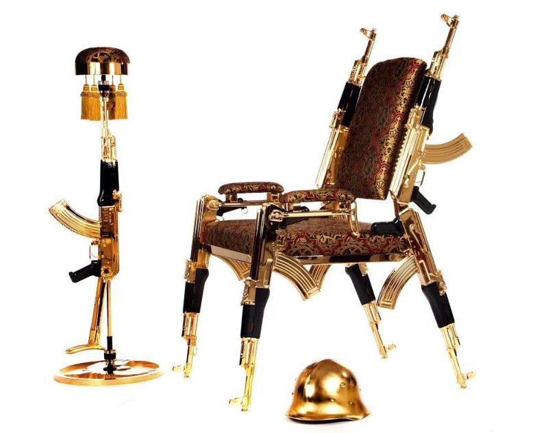 Художник Рейнир Вебер читал биографическую книгу о Михаиле Калашникове, когда к нему пришла муза. Он купил несколько АК-47 и собрал на их базе роскошный позолоченный стул из ткани из Лондона и Венеции. Теперь продает его за 127 000 долларов. В комплект также входит торшер и каска.