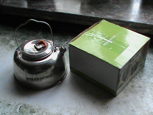 Бонусом к термосу идет вот такой новый чайник,нержавейка фирмы кемпинг.Объем 0,8 литра,лежит без дела,так как пользуюсь двух литровым.