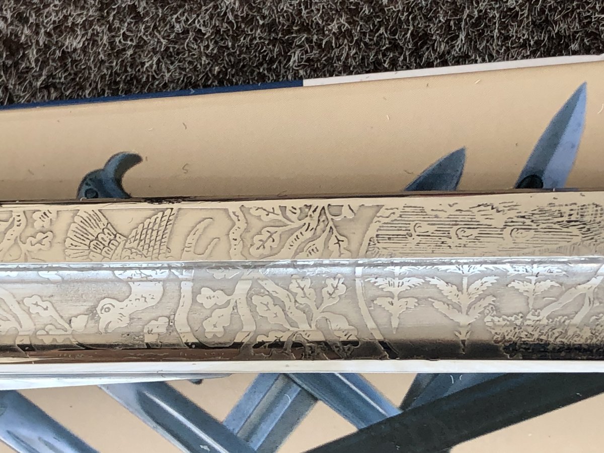 Штык с оригинальным травленивм. Травление наносилось на фабрике-изготовителе до нанесения никелировки и сборки штыка. Никелем покрыт сам рисунок. Лет восем назад я покупал такой штык в Европе без ножен за 900€. Здесь продал за 1600$.