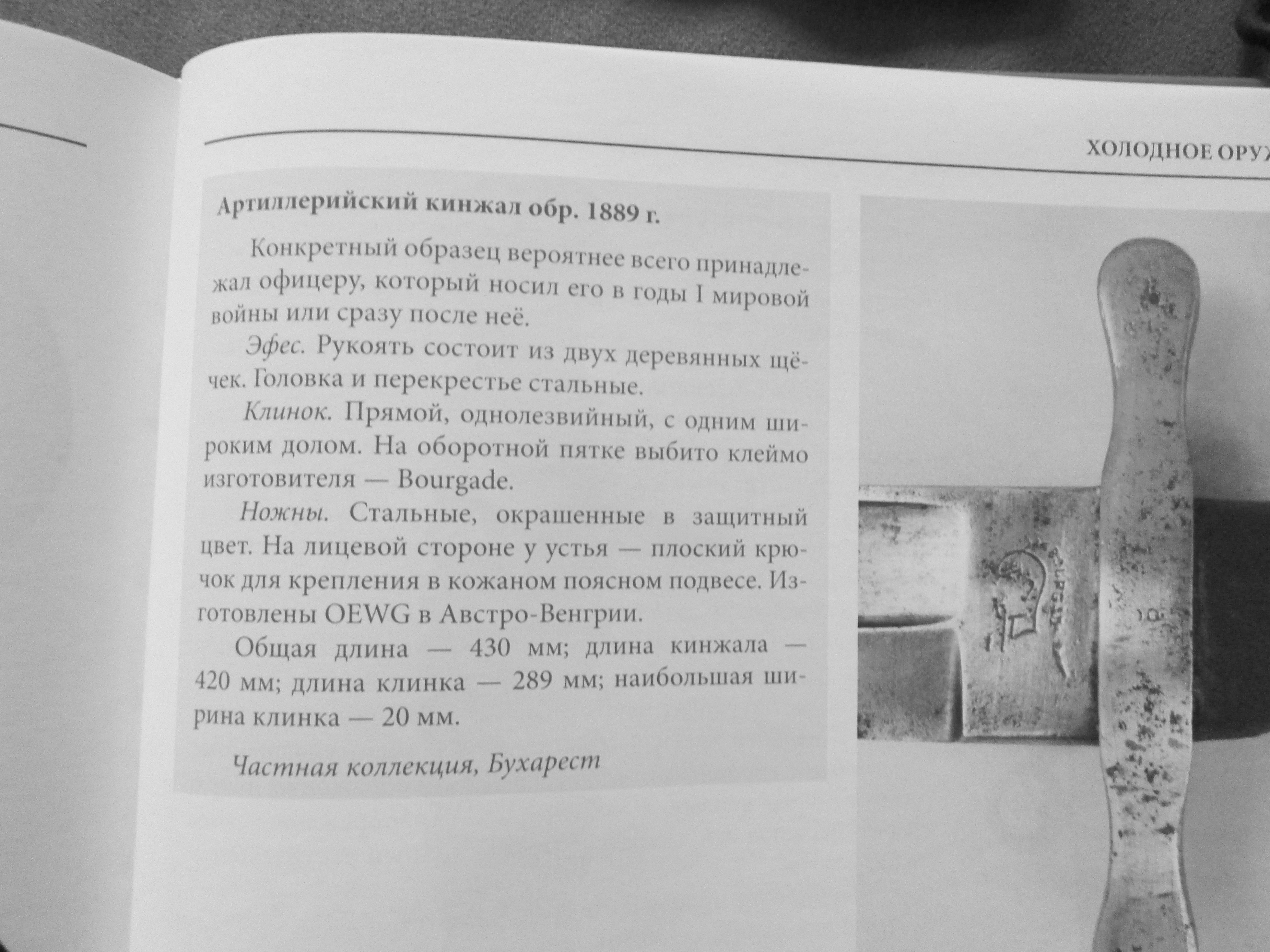 Скажу больше , вы не зря на него стойку сделали Автор книги Хория Владимир Шербенеску , заведующий фондами Нац военного музея в Бухаресте и сопредседатель движения военных реконструкторов румынии . Как известно коллекционеры ненавидят музейщиков из за противоположного отношения к истории предмета . Коллекционер обыкновенно акцентируется на первичном назначении ( как в царском указе сказано ) и игнорирует вторую а то и третью жизнь предмета . А музейщик наоборот делает упор на конечном этапе и последнем пользователе ( поступило из ..... ) . В данном случае особенно забавно , что правы оба . Именно такая модель тесака начала жизнь как специфический артилерист а кончила как аналог немецкого парадника ( внестроевой штык ) . И в принципе как хочешь так и пользуйся . Вот если бы был с мельхиоровой рукоятью или травой ......