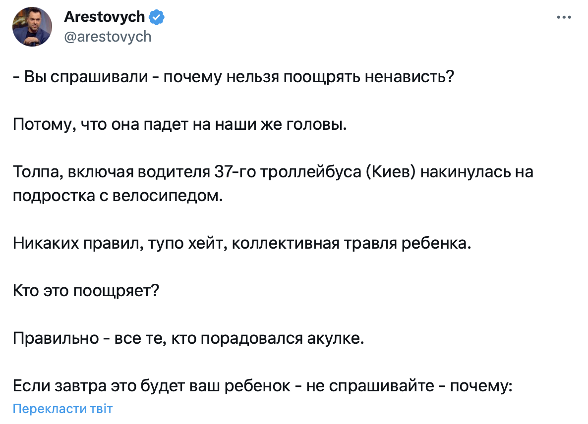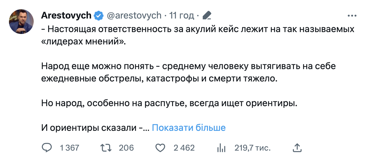 Я не думаю що хтось примусово розкачує цю новину, просто так працює зараз український інфопростір. Психологічне навантаження він суцільної сраки що відбувається безперервно навколо знаходить вихід у жартах, мемах тощо (якщо помітили ми це робимо постійно, не встигли цигани на першому танку в табір заїхать, а вже ширяться сотні мемів і складено тридцять три пісні, класні доречі - і так з будь якою подією). Поржали і забули через два дні, бо інофприводів стільки що кожен наступний перебиває попередній. Тут було б точнісінько так само, але раптово на сцену виліз "містер мораліст" (що дуже смішно насправді, якщо розуміти яке він безпринципне гівно) з чисто руснявим наративом про те що в українців виявляється немає морального права знущатись над загибеллю росіянського шматка лайна бо це "набєрітє побольше воздуха"(с) РАСЧЄЛОВЄЧІВАЄТ. Зрозуміли шутєєчку? Вбивці, гвалтівники, крадії, просто нечисть і мразота на лиці землі робить нам зауваження ротом Арестовича про нелюдяне ставлення до їх проблем. Бо хто дозволив собі жарт над дохлою руснею той, увага, ПРОГРАВ ЗЛУ І САМ СТАВ ЗЛОМ. Зацініть, зло тепер не бурят що обстріляв човен з рятівниками, а умовний Пряніков який на словах порадів за ту рибну консерву. І от оце вже хитнуло ситуацію далі, бо саме так ми реагуємо на калічні спроби нелюдей навчати нас людяності