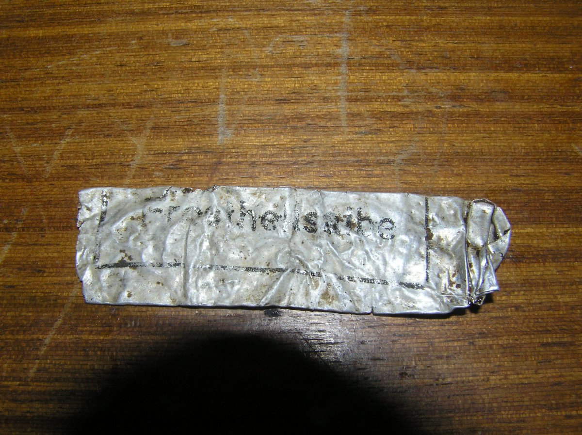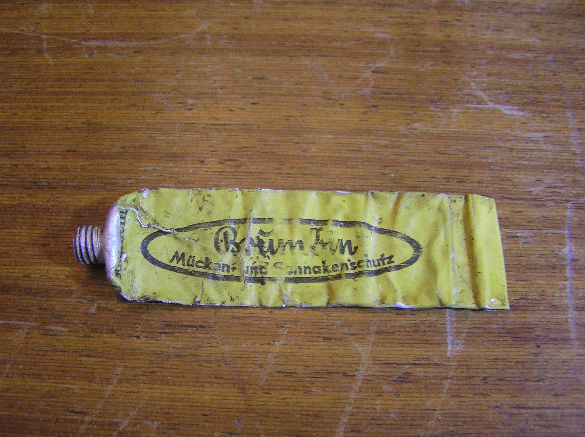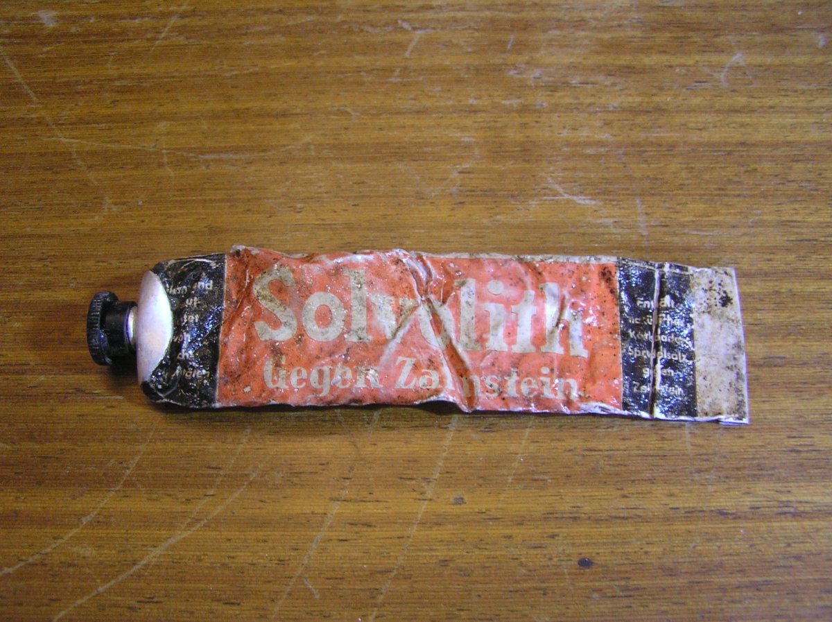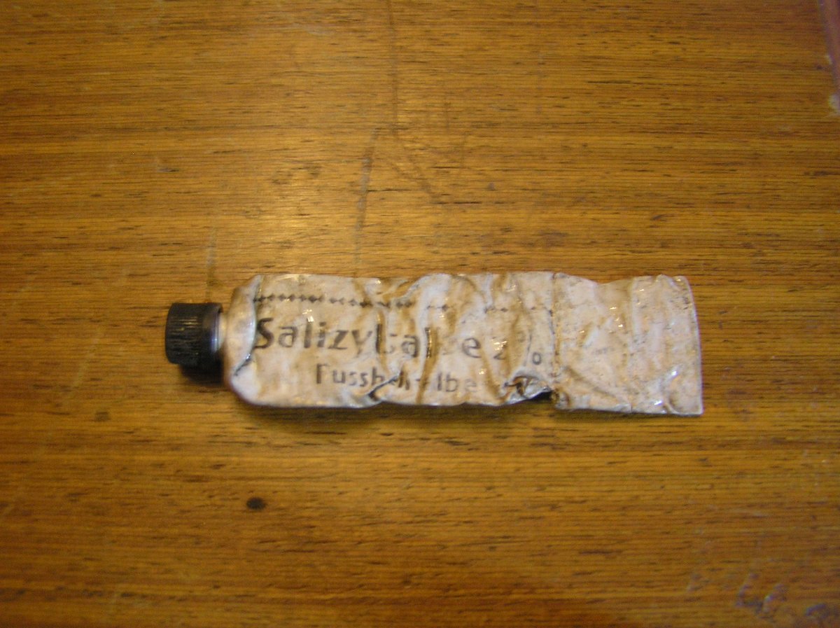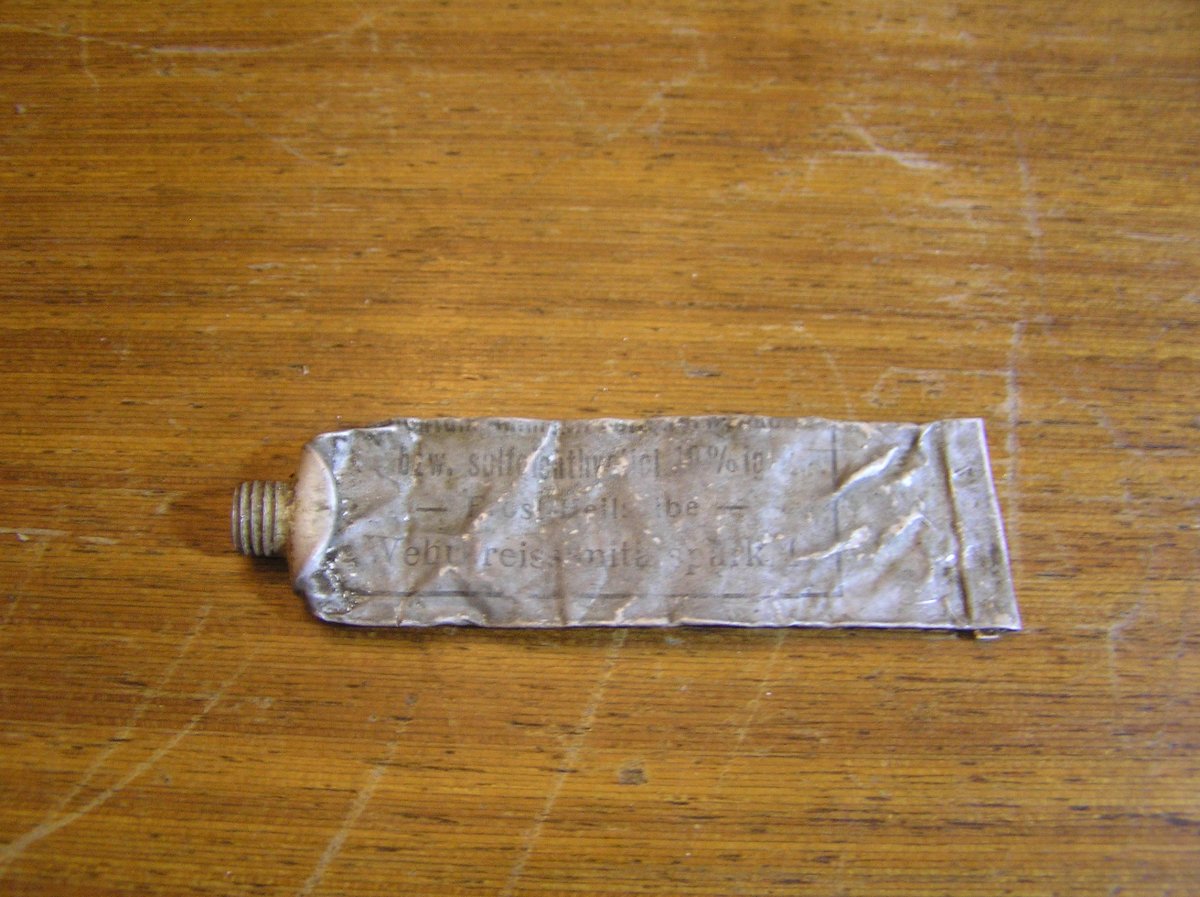 Дорого дня! я конечно понимаю что тема заезженная, но всё же... мне очень нравятся немецкие и не только тюбы (я знаю что далеко не одинок в этом). Я вот почистил и рассортировал свои, не много конечно, но кой-чего накопилось. хоть в нете тьма инфы на этот счёт, я думаю что особенно начинающим она будет полезна. к тем более кое что я сам не смог опознать - посему сам нуждаюсь во мнении людей сведомых! 1. "Korperschutzsalbe" - антисептическая мазь общего применения 2. "Fubschweibsalbe" - мазь для борьбы с опрелостями на ногах 3. "Alkalischesalbe", ("Alkalische Augensalbe ") - алкалиновая мазь, ( алкалиновая мазь для глаз). 4. "Ichthyolsalbe" - ихтиоловая мазь. 5. "Salizylsalbe" - салициловая мазь для лечения ног(от грибка) 6. "Nasensalbe" - мазь для носа, что-то типа "звездочки" 7. "Unguentum Ammonil Sulfokarwendolicil" - мазь от обморожения. 8. "Frostheilsalbe", "Frost-Heilsalbe" - лечебная мазь от последствий обморожения. 9. "Borsalbe" - борная мазь. 10. "Marsch Getrank" - растворимый маршевый напиток. 11. "Tannalbin 0,5%" - Соединение танина с альбумином. Применяют как вяжущее средство при острых и хронических заболеваниях кишечника (поносах). 12. "Gummilosung" Резиновый клей — раствор натурального каучука в бензине. Применяют для склеивания резиновых и резинотканевых изделий (резиновая обувь, автопокрышки и др.), прорезиненных тканей для крепления резины 13. "Mucken und Schnakenschutz" - мазь для отпугивания комаров. 14. "Savon dentifrice" - зубной порошок(фран.). 15 Универсальный клей. 16,17 "Zahnpaste" - зубная паста. А вот собственно и вопросы... Крышка с пеликаном, вроде как от консерв каких - встречалась кому? колечко с надписью HUGO SCHNEIDER PTR 555 A.G. LEIPZIG. загуглил - контора выпускала киросинки, вопрос - это деталь от керосиновой лампы? далее крышка с надписью Allrei - я так понимаю что-то типо зубного порошка? далее баночка с надписью ...ermanento - вас ис дас? ну и последний вопрос - самый сложный ввиду плохого сохрана. вот что мне удалось прочесть и перевести... Delespa - диаметр, Rasrerserfe - бритвы, Sohre - соус))) я понимаю что перевод яндекса "не всегда корректен", но есть мнение что это крем для бритья, верно ли?